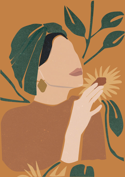 A young woman face with gold earrings with a tropical plants in a minimalist, abstract trendy style