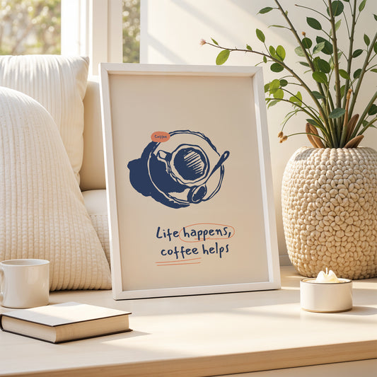 Life Happens, Coffee Helps" – Minimalist Coffee Quote Poster
