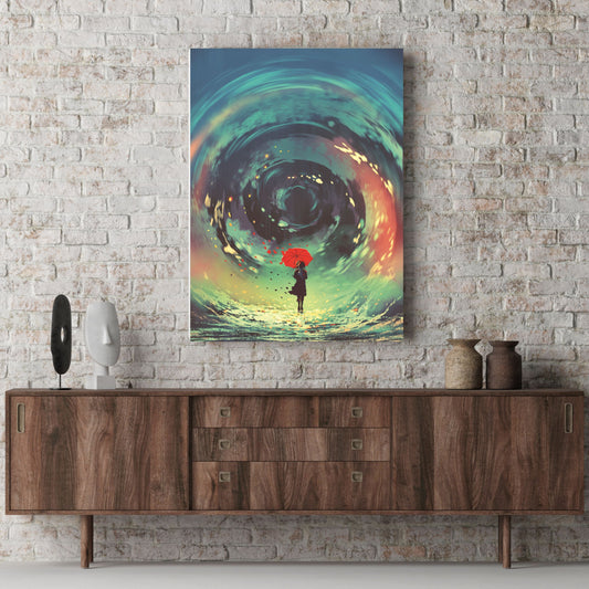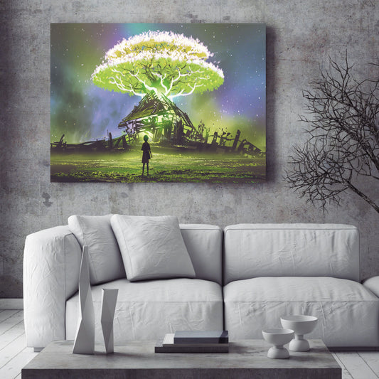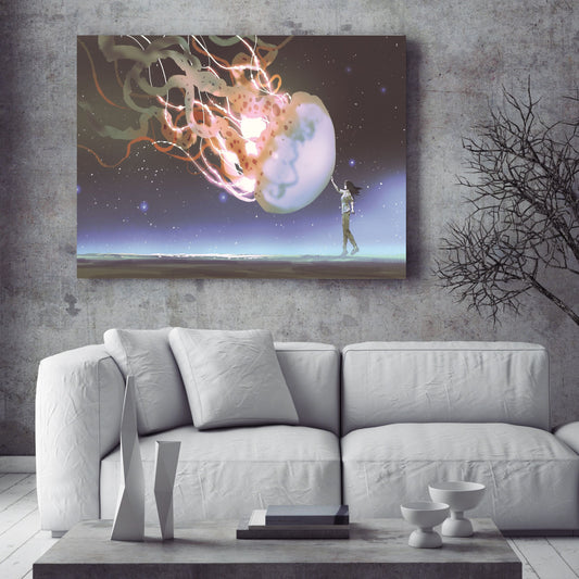 Woman reaches out to touch the fantasy jellyfish floating in the air
