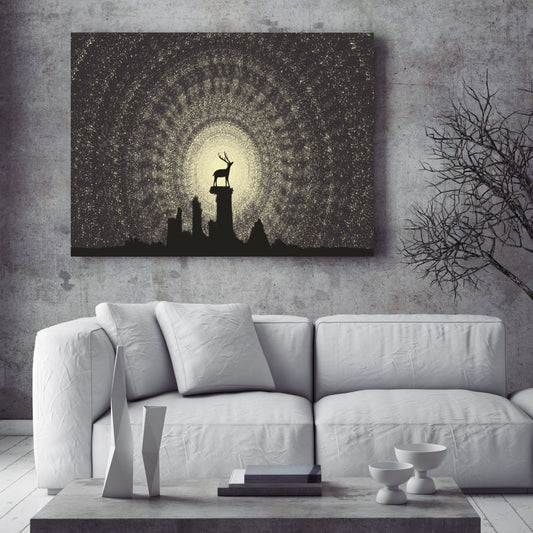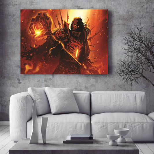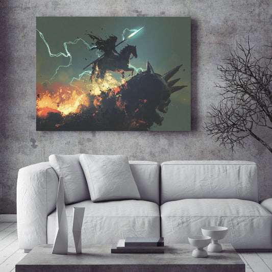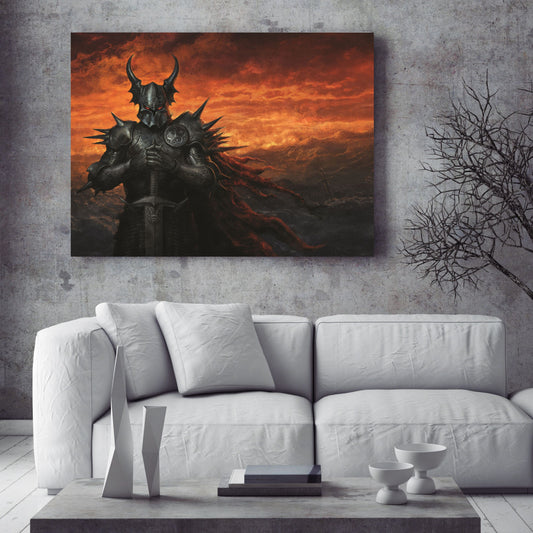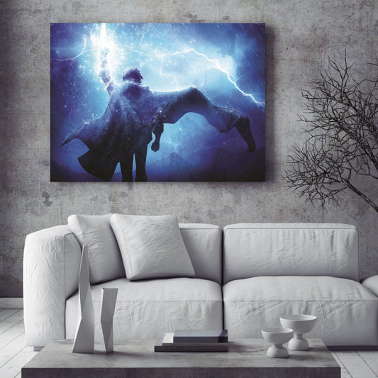 The silhouette of a fantasy hero with a long cloak fluttering in the wind