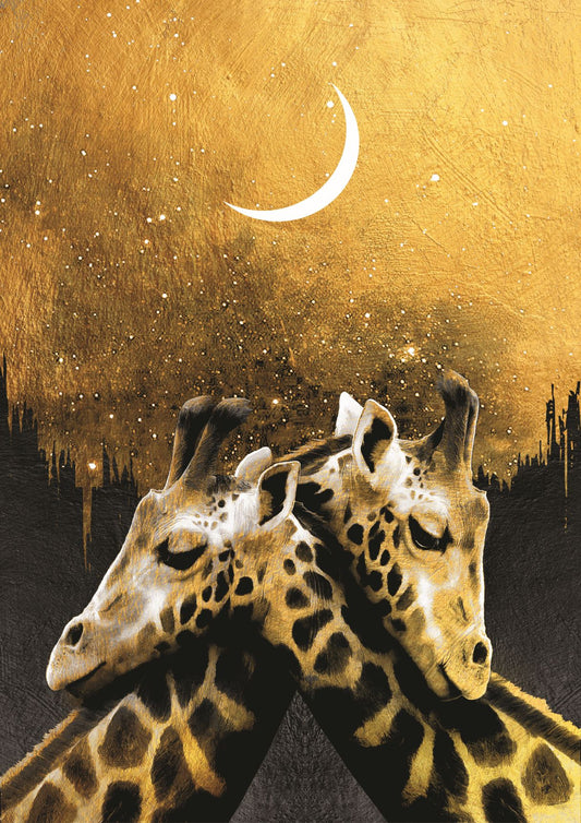 Modern abstract gold painting of lovely couple giraffe at night galaxy sky moon