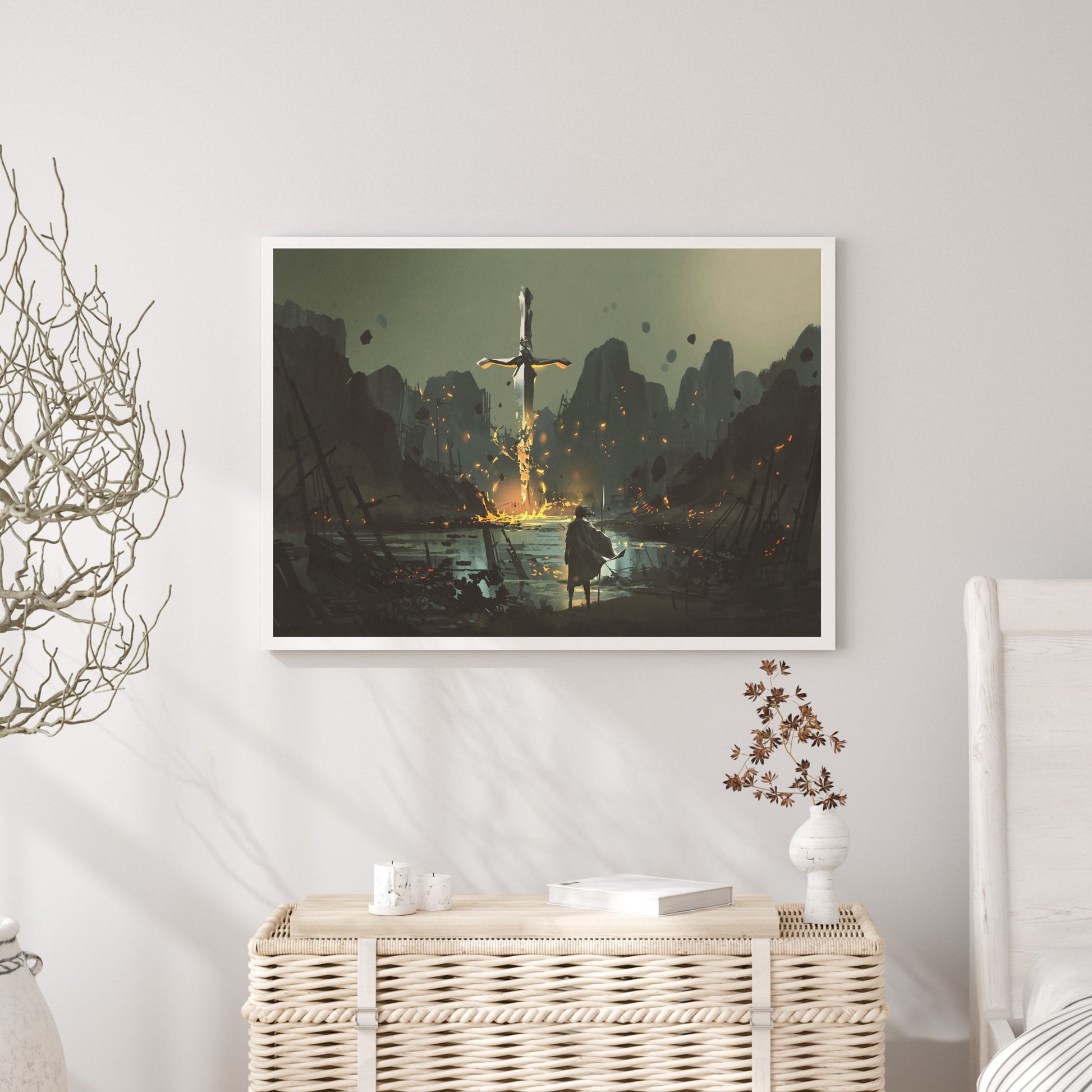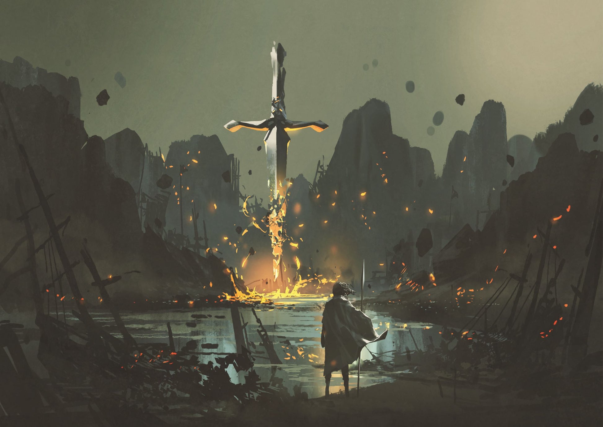 A warrior standing at the abandoned port and looking at the broken giant sword