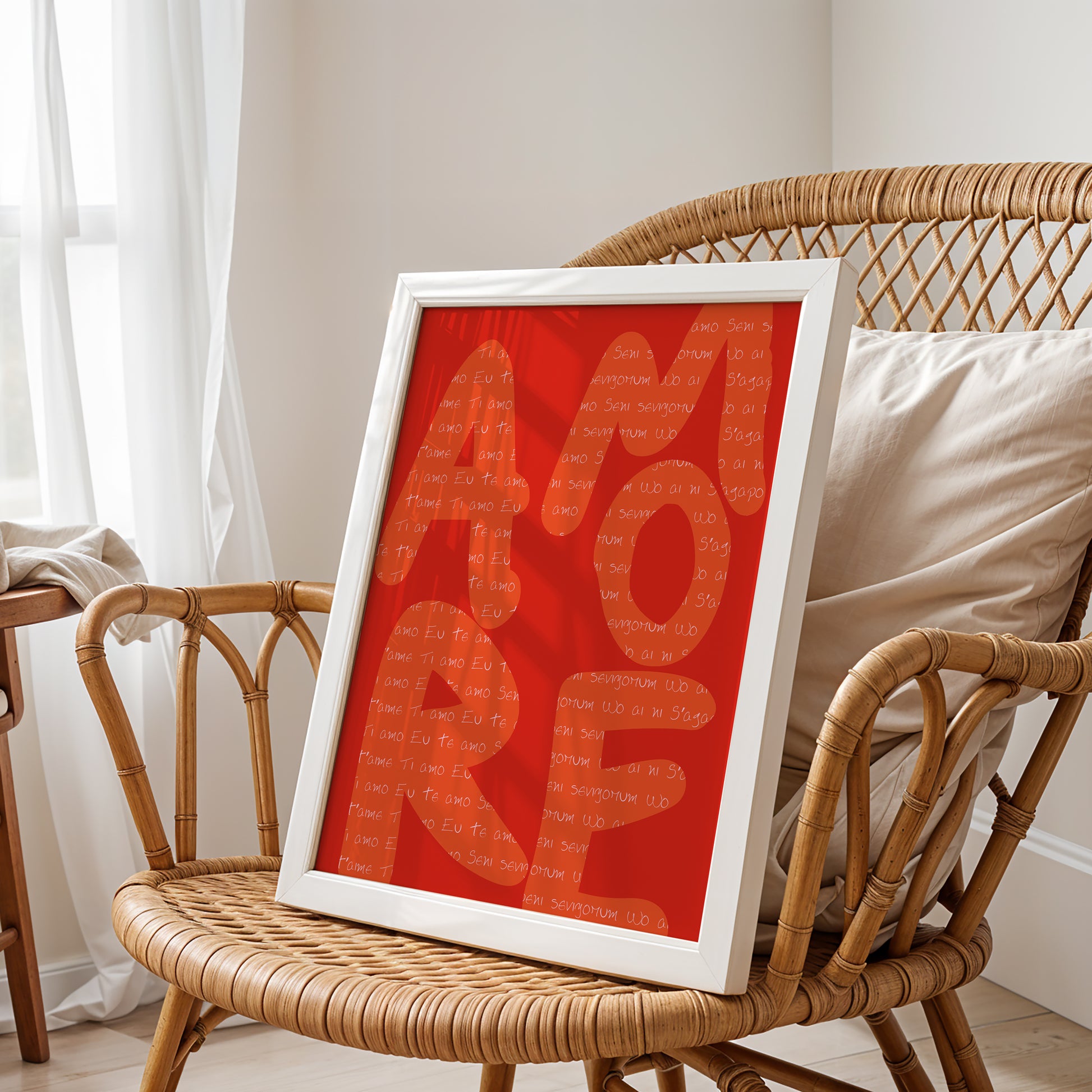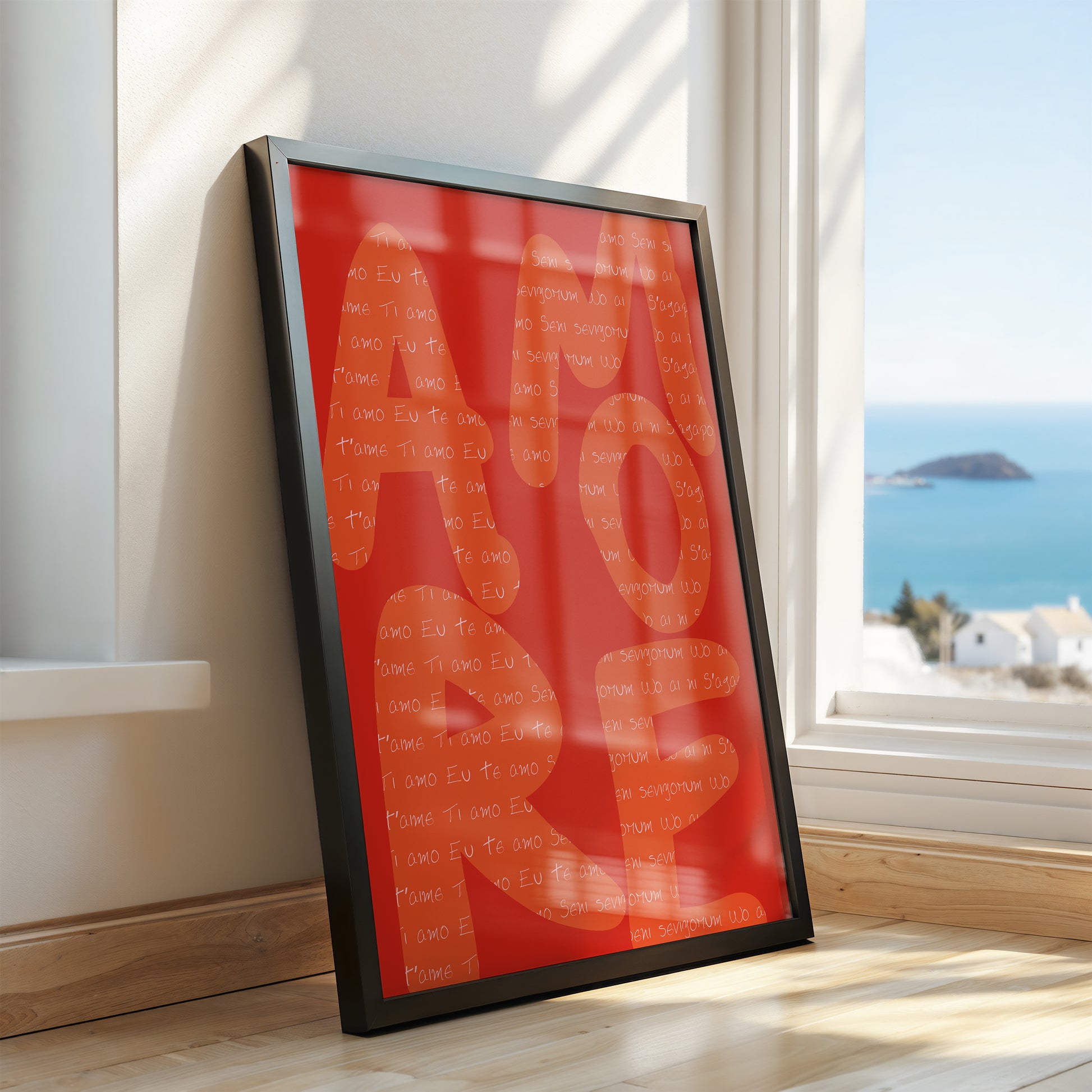 Love is a universal language, and this poster says it all. Our "Amore" print is a passionate celebration of love in its many tongues. The bold, warm orange typography pops against a rich red background, which features the phrase "I love you" written in scripts from around the world.