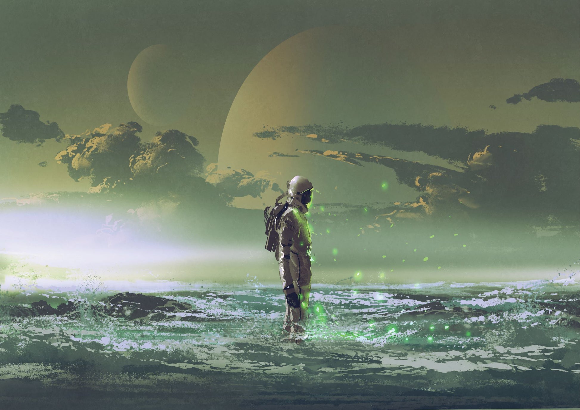 Astronaut standing by the sea against background of the planet