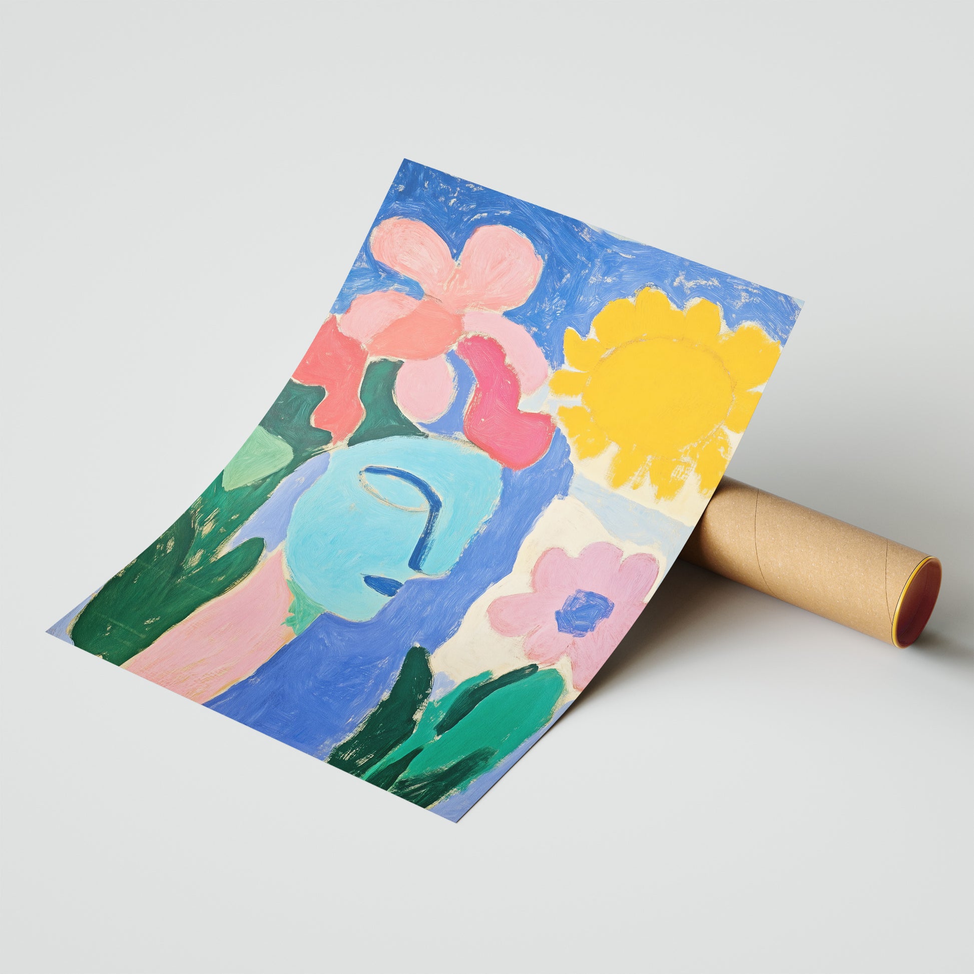 "Azure Contemplation - Floral Serenity" offers a striking Post-Impressionist portrait with a serene, azure-hued face framed by soft pinks and surrounded by bold, vibrant flowers. The simplified forms and intense colors create a powerful emotional resonance, evoking a sense of calm and introspection. This artistic piece is perfect for adding a touch of modern sophistication and reflective beauty to your decor.