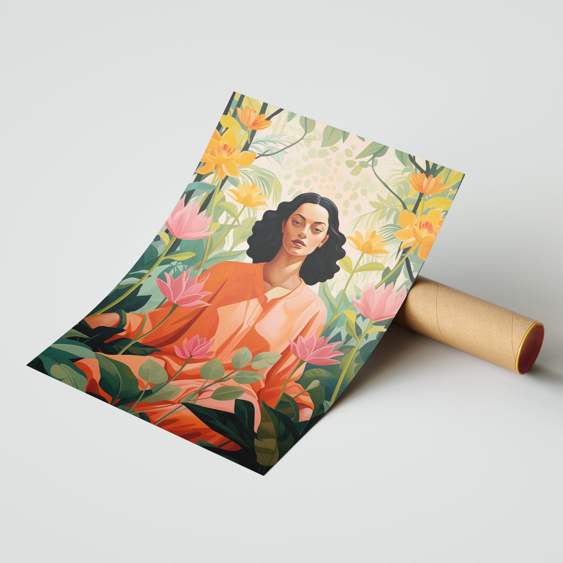 Step into serenity with this tranquil art print featuring a peaceful woman surrounded by lush, blooming florals in soft pinks, yellows, and greens. Her gentle expression and mindful presence evoke relaxation, clarity, and grounded confidence. Perfect for bedrooms, reading nooks, or yoga spaces, this artwork inspires daily mindfulness and the calm beauty of nature.