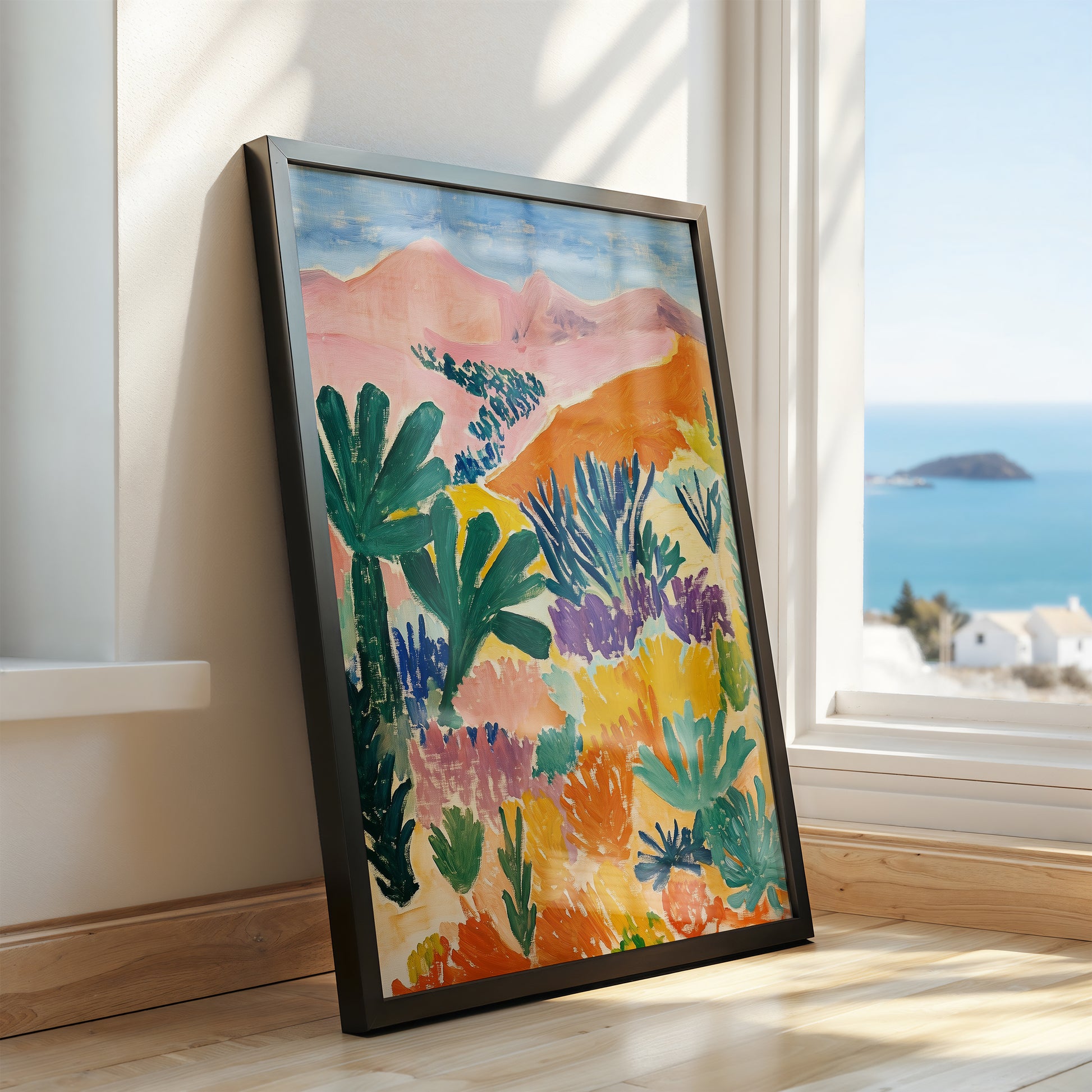 "Canyon in Color" captures the surprising vibrancy of a desert landscape in bold Post-Impressionist style. This poster features stylized cacti and colorful desert scrub in hues of purple, turquoise, and orange, set against warm, sun-baked hills. The expressive brushwork and vivid palette transform the arid landscape into a lively celebration of nature's resilience and beauty.