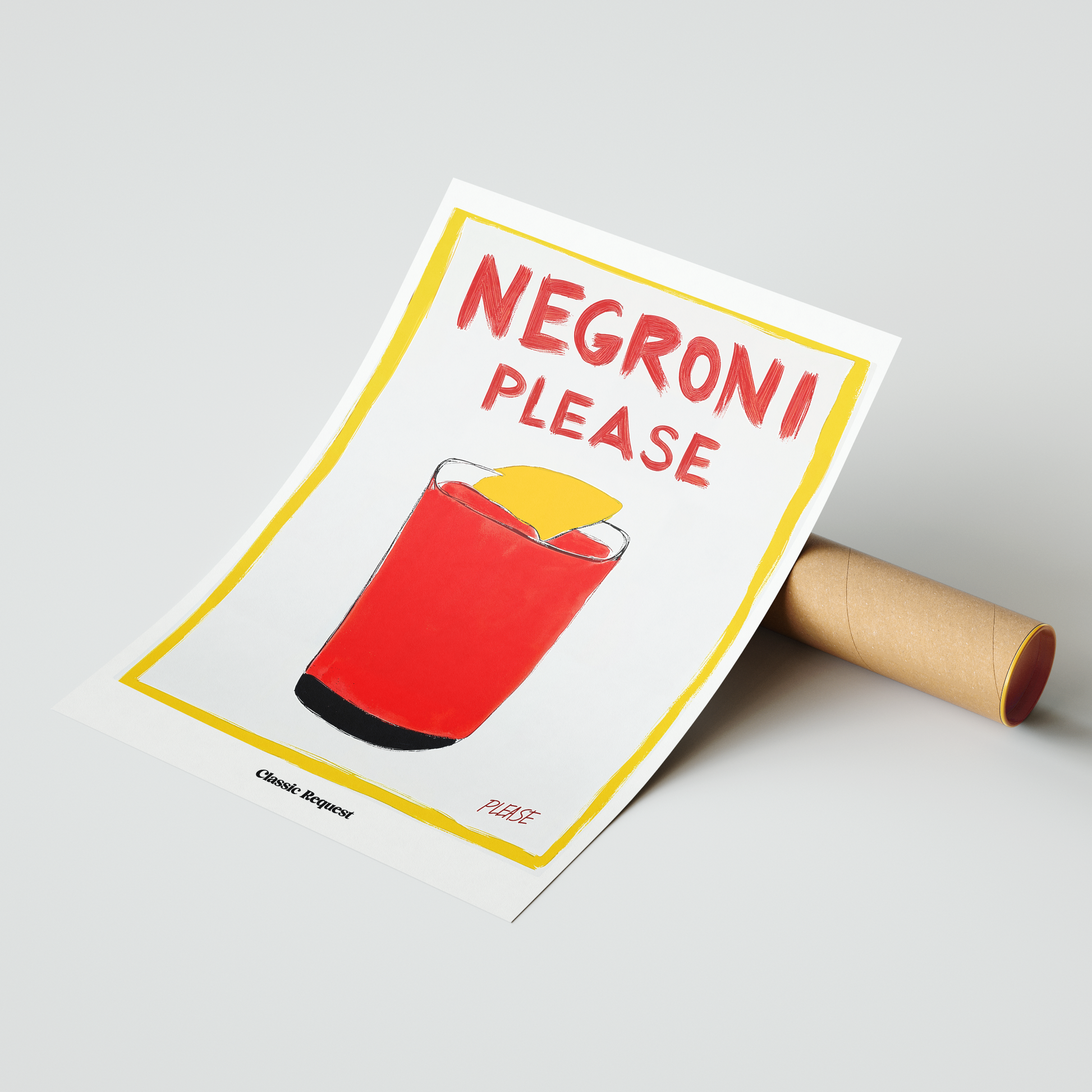 Sleek, bold, and refreshingly direct—"Classic Request: Negroni Please" is the ultimate wall art for every cocktail aficionado. This charming print from the Dopamine Gallery collection features a vibrant red Negroni topped with a citrus twist, surrounded by hand-lettered text in punchy red and framed by a sunny yellow border. Ideal for bars, kitchens, dining rooms, or stylish entertaining spaces, this poster delivers both modern flair and timeless taste. Hang up "Negroni Please" to broadcast your favorite order or simply add a splash of Italian apéritif zest to your decor—cheers to classic cocktails made with style!