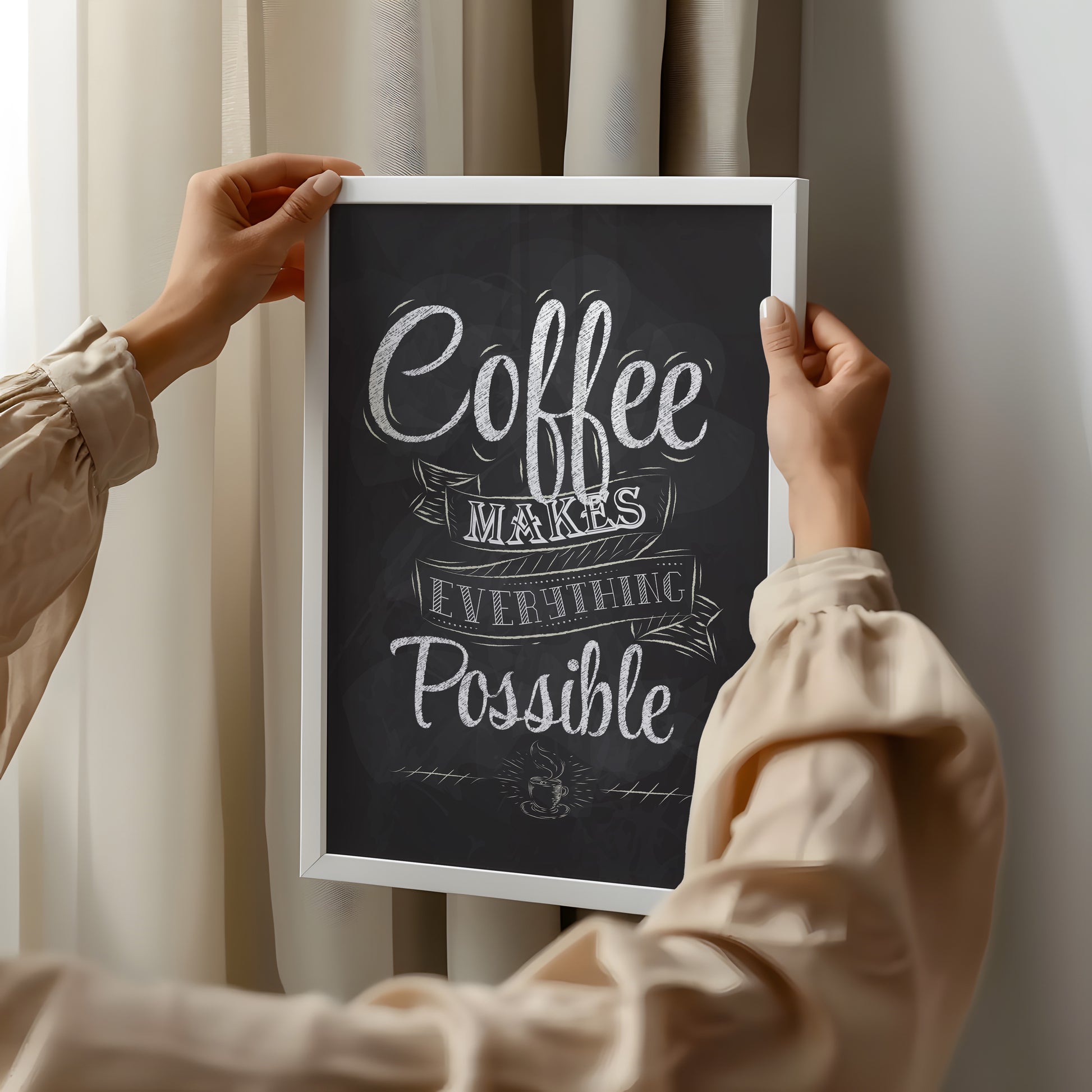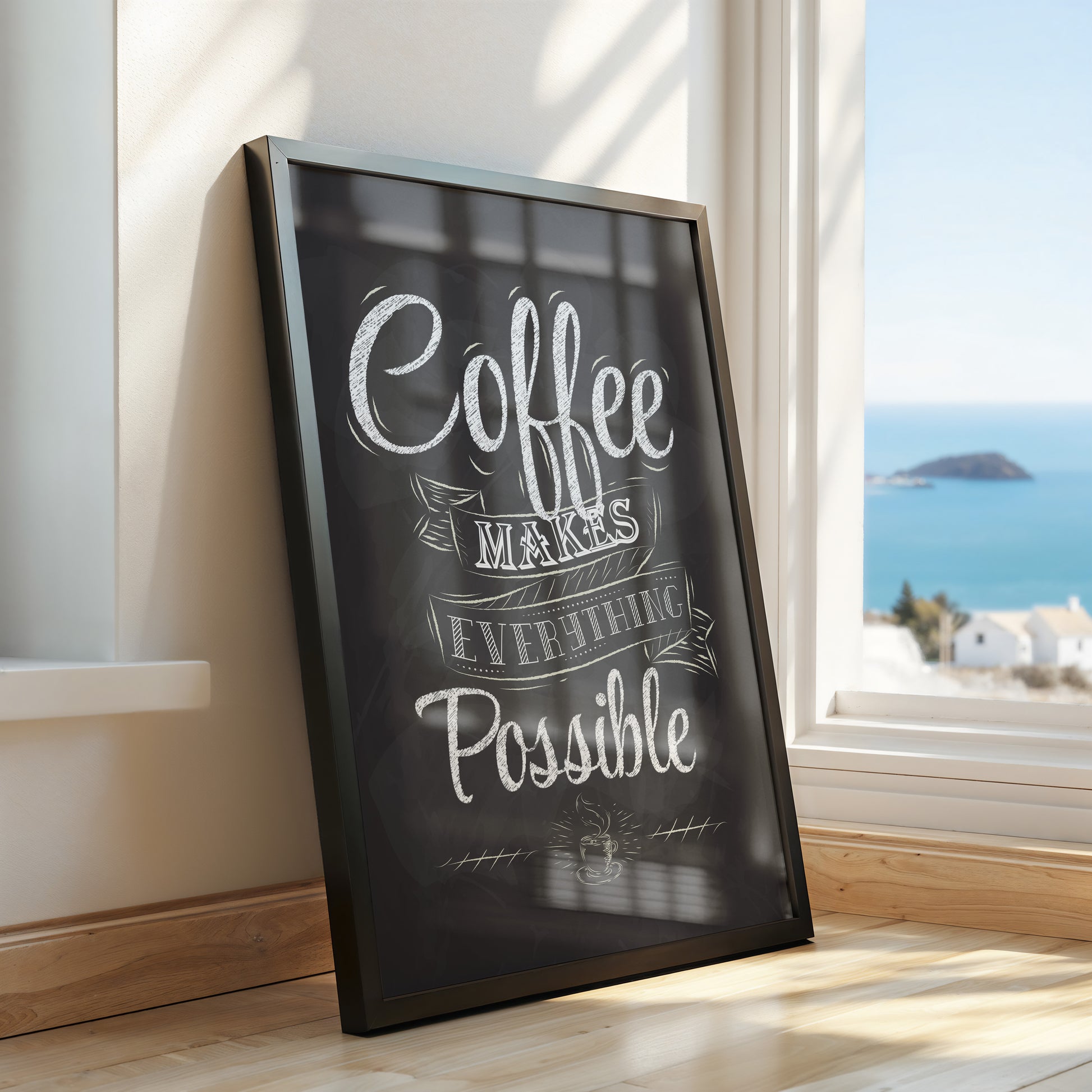 Unleash your creativity and fuel your day with our "Coffee makes everything possible" poster. Hang it in your home or office as a daily reminder of the endless possibilities that coffee can provide. Perfect for coffee lovers and those in need of inspiration.