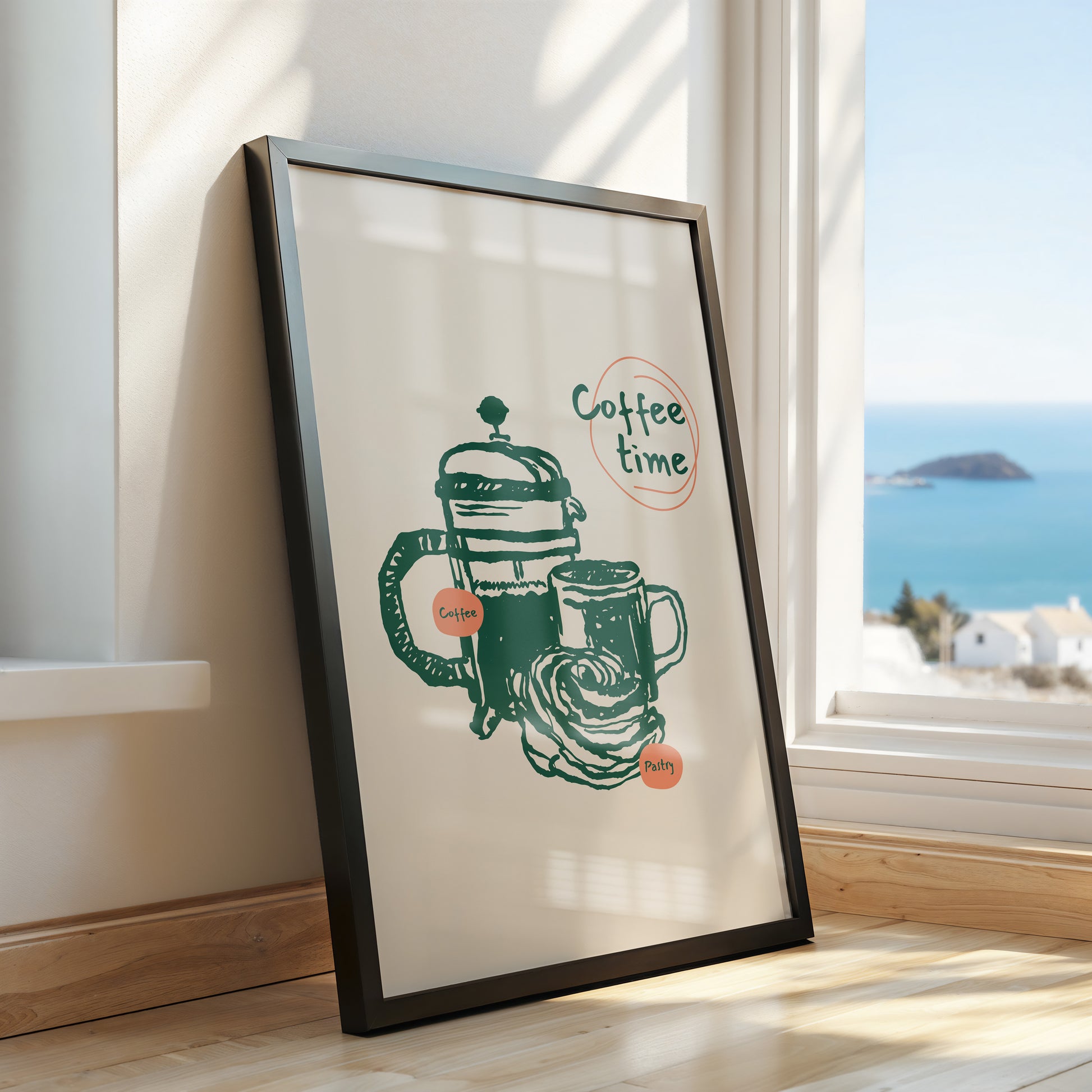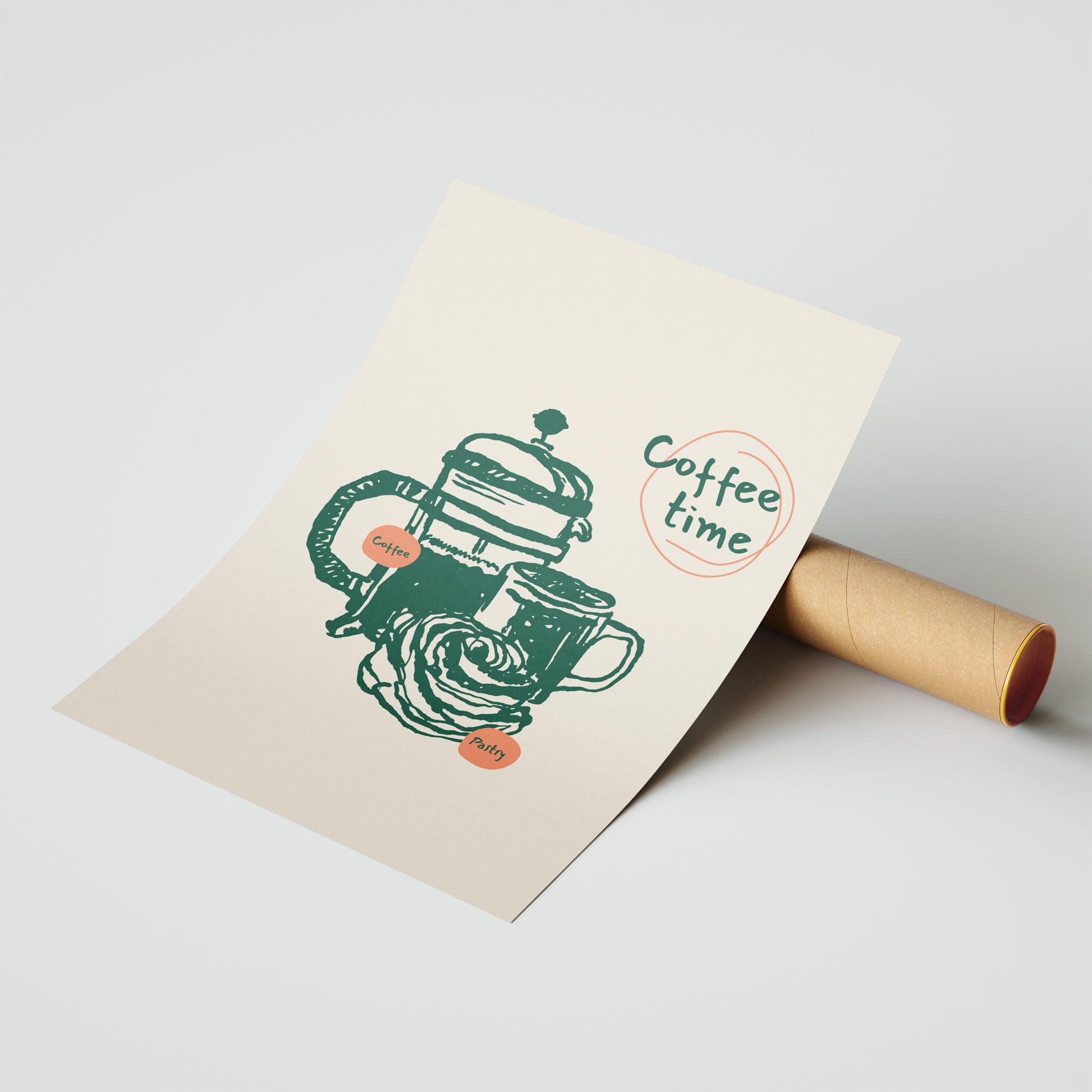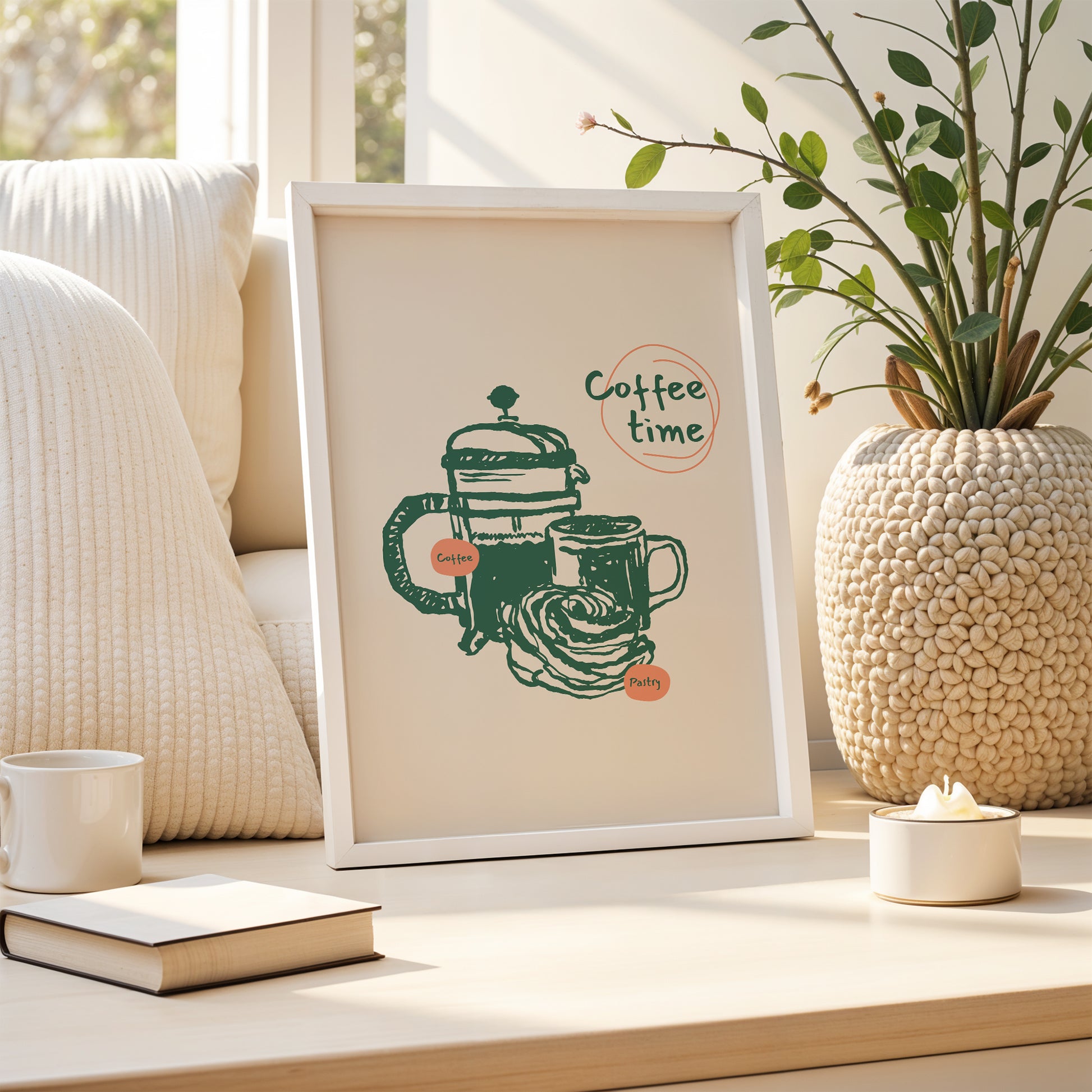 Celebrate the beloved ritual of a freshly brewed coffee with this warm and rustic art print. This piece beautifully captures the simple joy of "Coffee time," featuring a charming, hand-drawn illustration of a classic French press, a welcoming mug, and a sweet pastry.