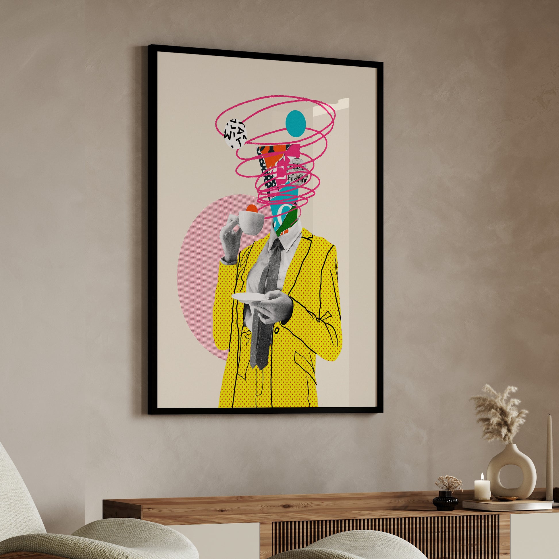Add a bold splash of imagination to your space with this quirky and thought-provoking poster featuring a suited figure sipping coffee as a vibrant swirl of colors, symbols, and abstract shapes erupts from his head. A brilliant blend of pop art and surrealism, this piece captures the beautiful mess of overthinking, caffeine-fueled creativity, and modern chaos.