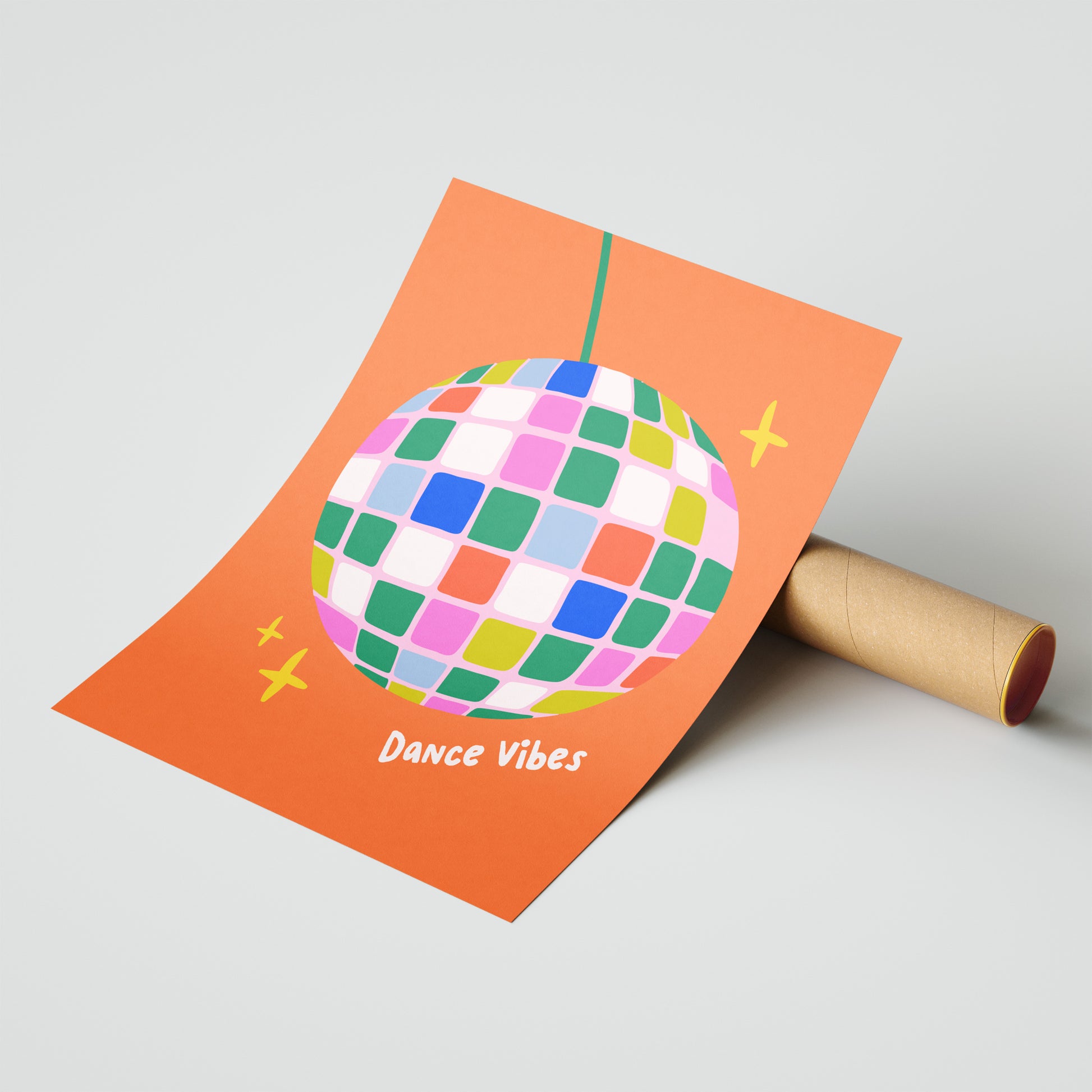 Bring the energy of the dance floor to your space with this vibrant "Dance Vibes" poster. Featuring a colourful disco ball design on a bold orange background, this artwork is perfect for music lovers, creative rooms, or anyone who wants to add a touch of fun and nostalgia to their decor. Printed on high-quality paper, this poster will keep the party spirit alive wherever it's displayed.