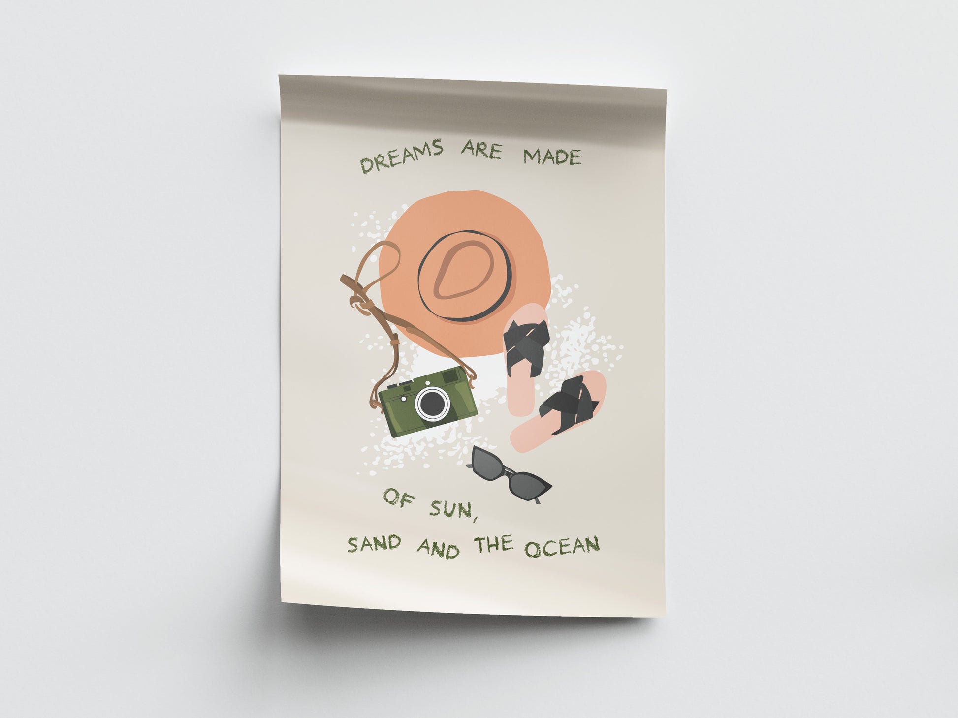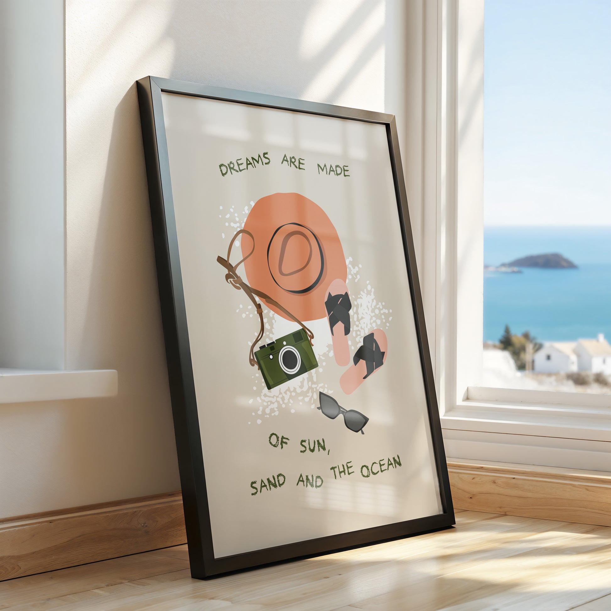 Indulge in the peaceful tranquility of a sunny beach, soft sand between your toes and the sound of the ocean lulling you into ultimate relaxation. This stunning travel quotation poster captures the essence of a dreamy vacation, inspiring you to make it a reality.