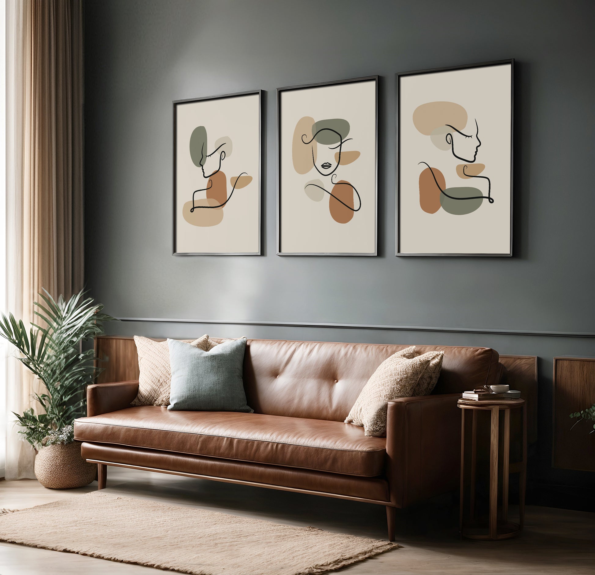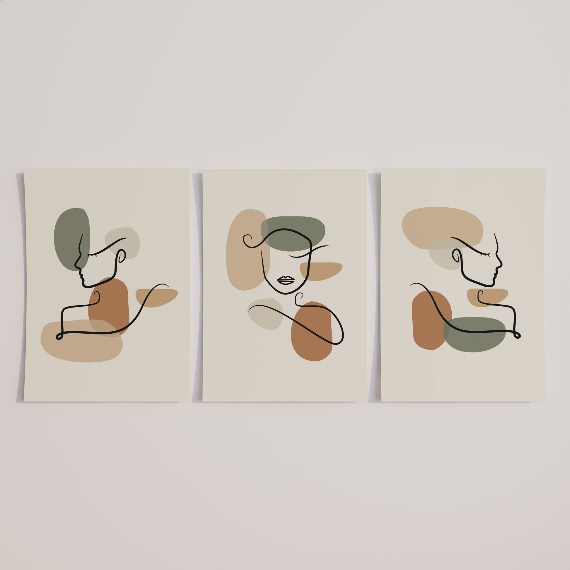 Each piece celebrates the elegance of the female form through a single, flowing line, creating a sense of effortless sophistication. The artwork is brought to life with a soothing and on-trend color palette of warm terracotta, gentle sage green, and neutral beige. These earthy tones create a warm, inviting atmosphere, making them the perfect focal point for any room.