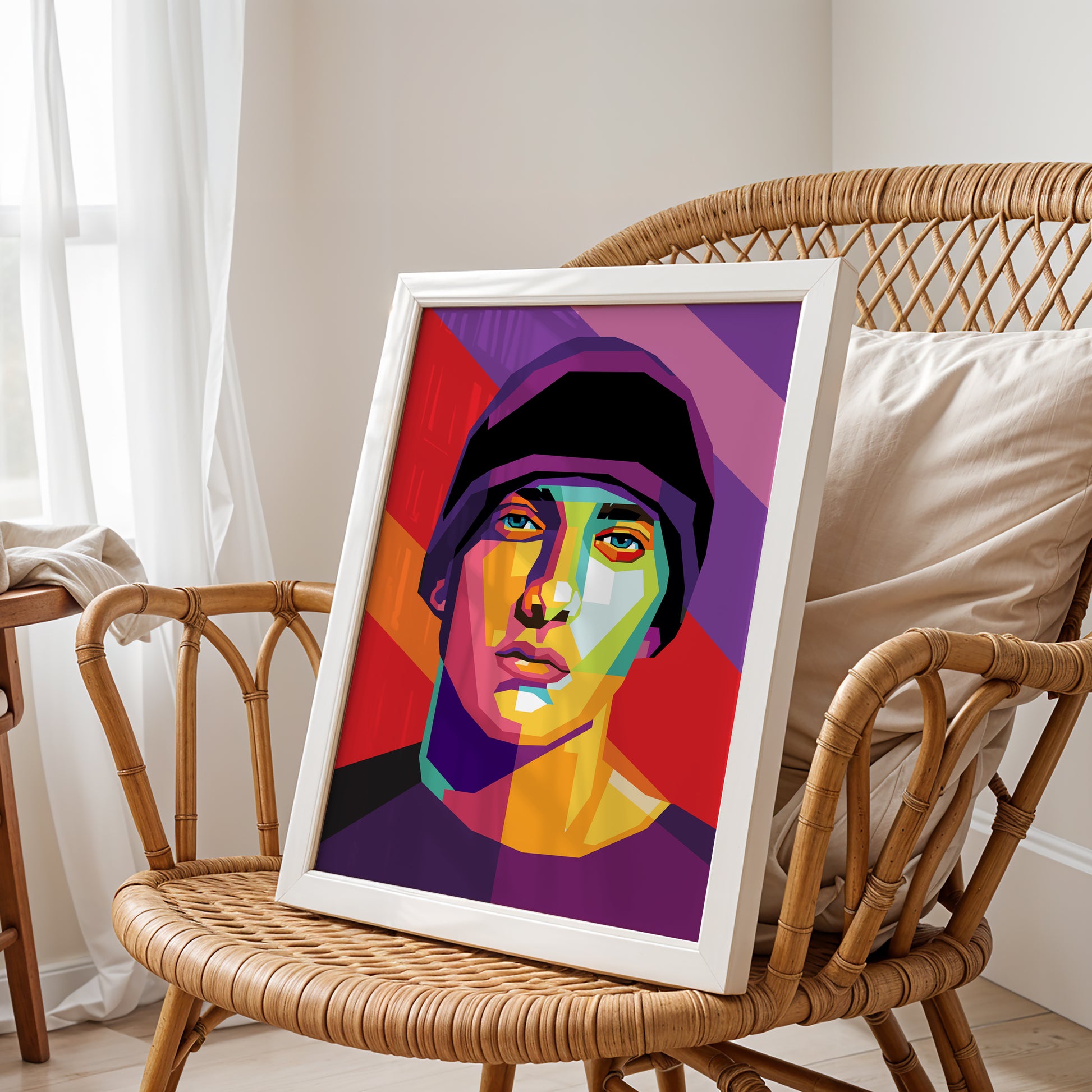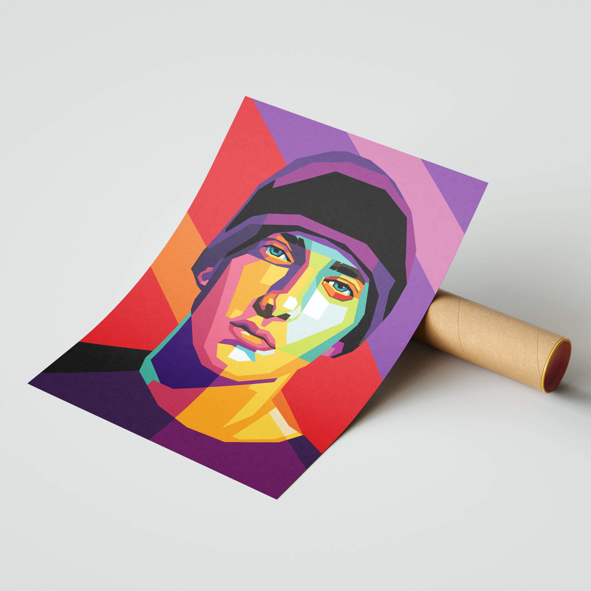 Celebrate iconic style with this Eminem Pop Art (WPAP) print. Featuring bold geometric shapes and vibrant colors, it captures the energy and attitude of the legendary rapper. Perfect for adding a modern, artistic touch to your space, this artwork makes a striking statement that reflects your passion for music and contemporary art. Elevate your decor with this unique piece that blends creativity and culture effortlessly.