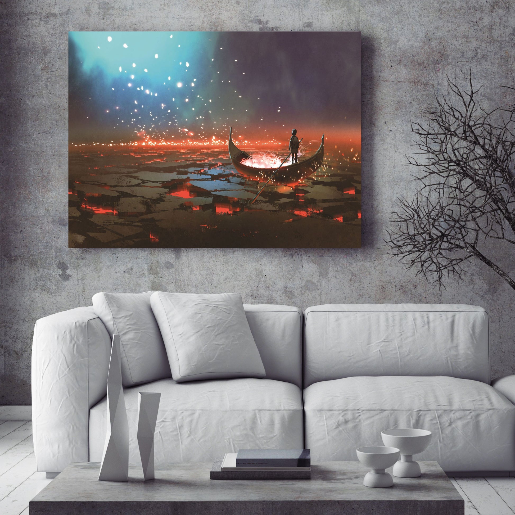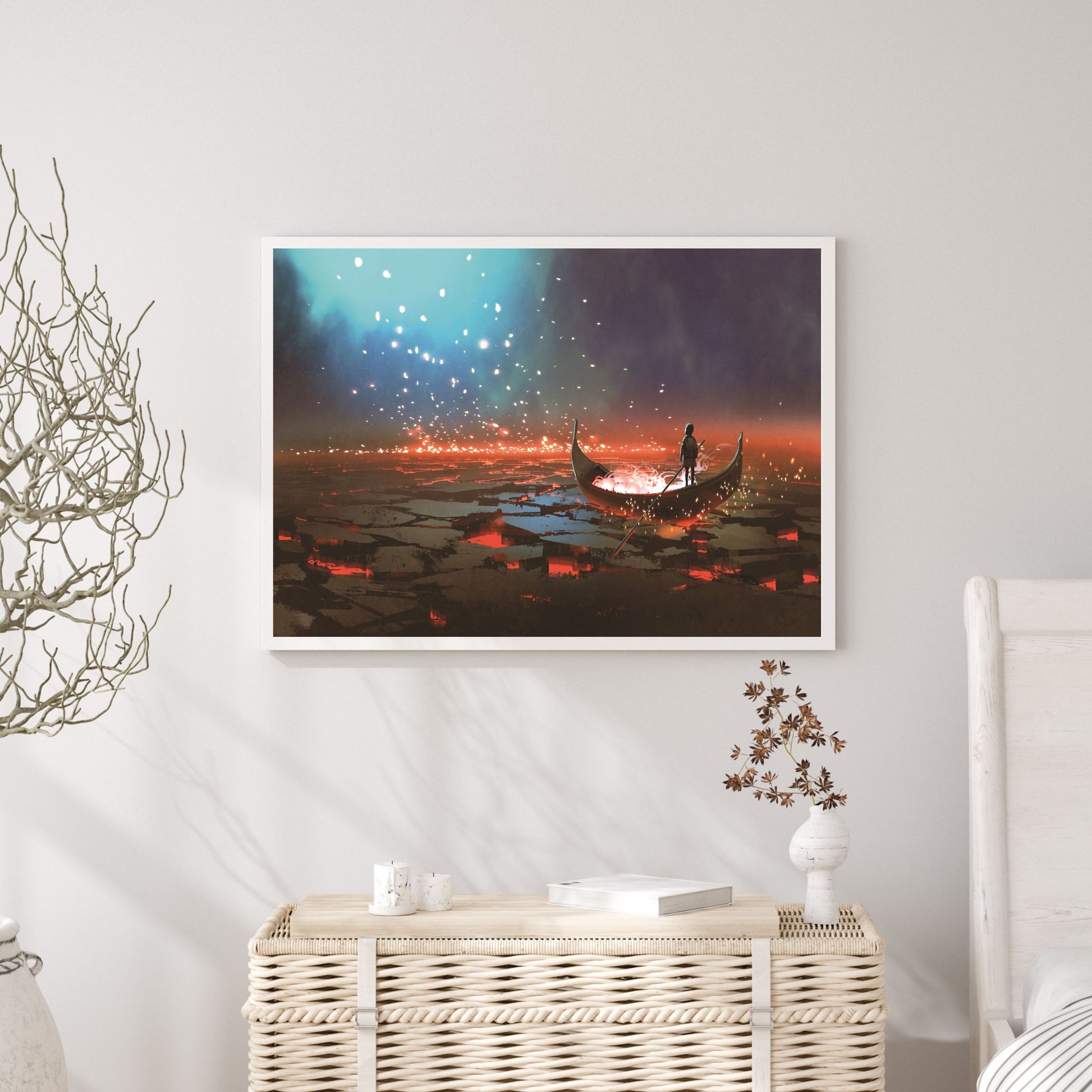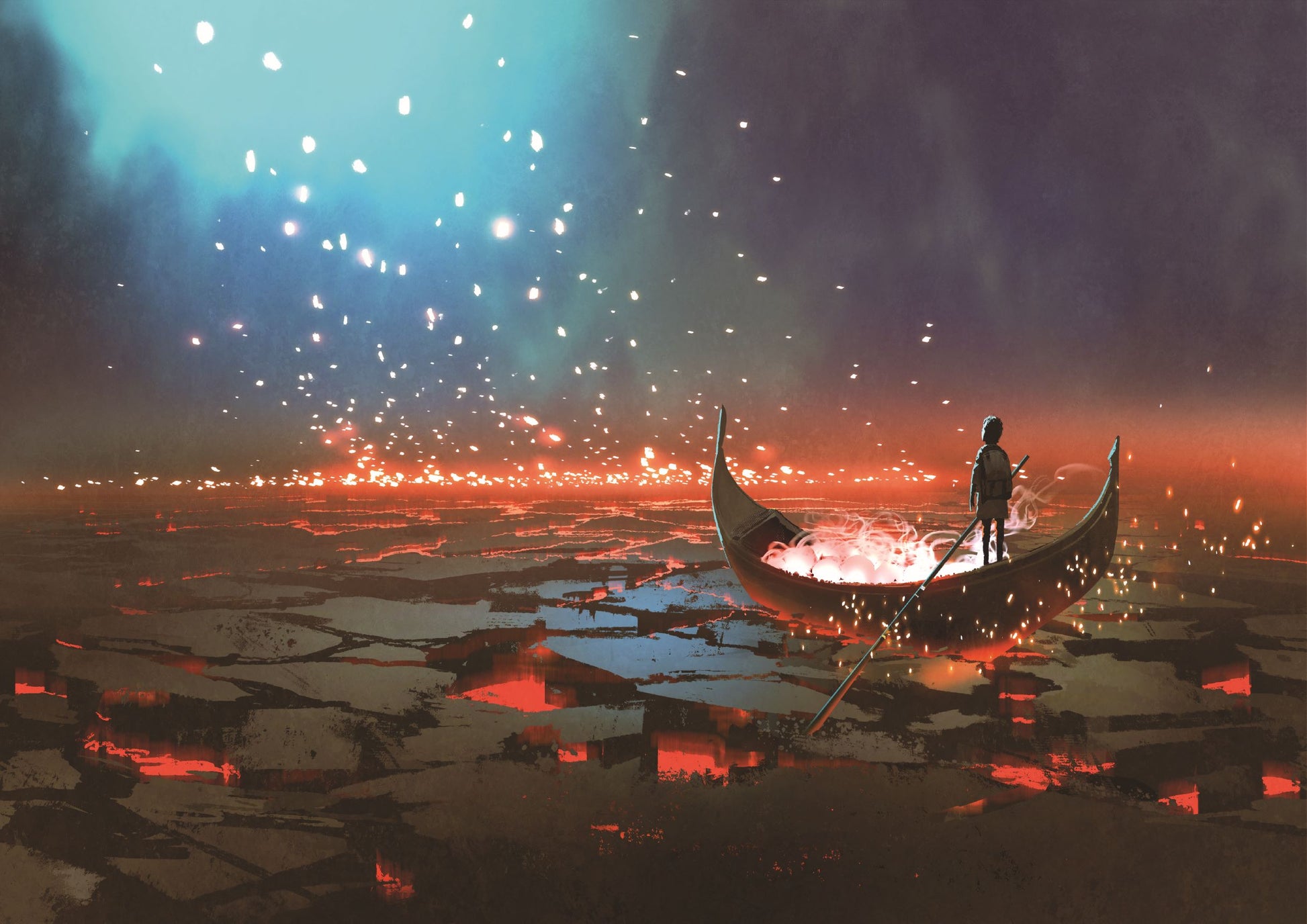 Fantasy world scenery showing a boy rowing a boat in the land of volcanic, digital art style