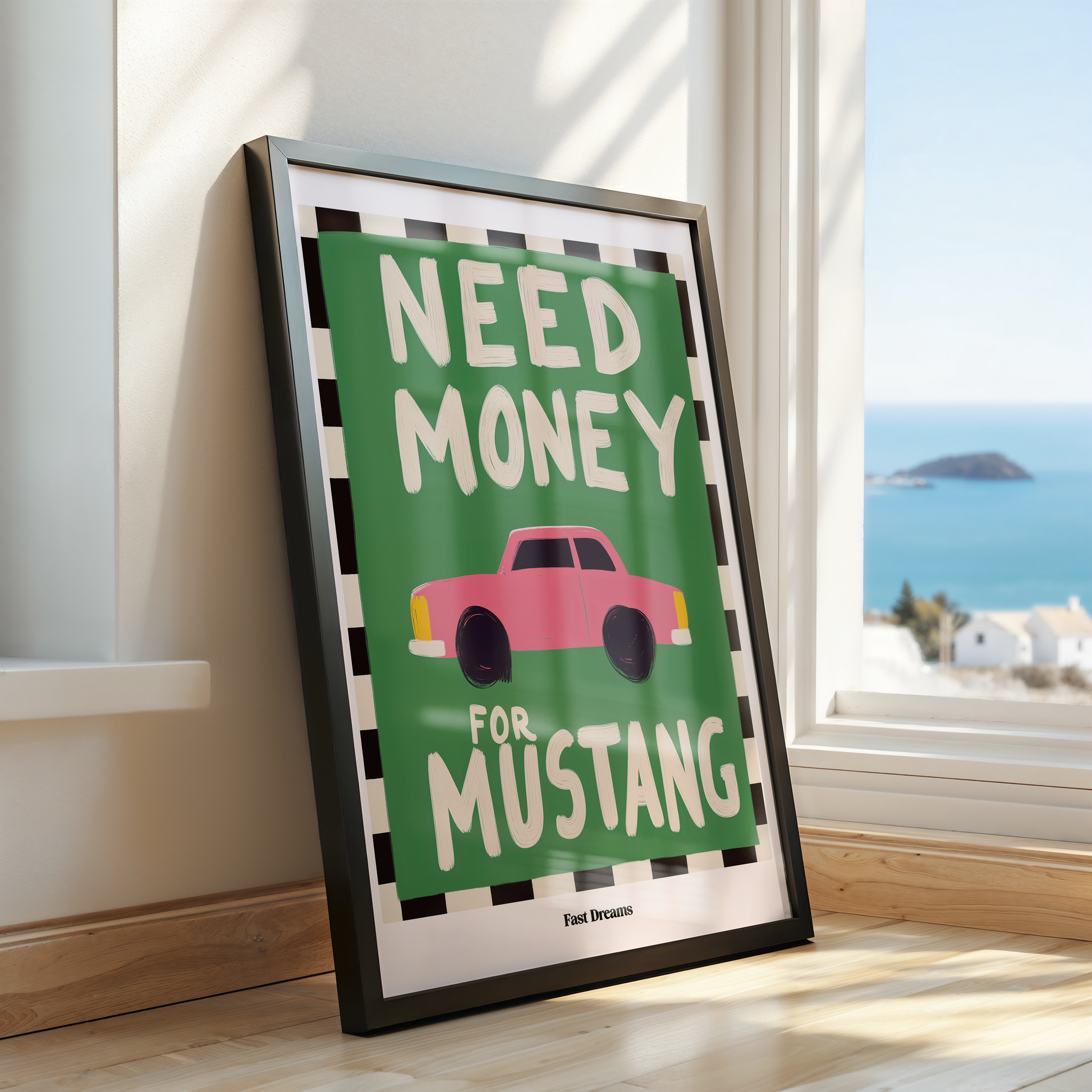 Ignite your walls with humor and ambition in "Fast Dreams: Need Money for Mustang," a playful and bold print from the Dopamine Gallery collection. Featuring a hand-drawn pink car on a green field, surrounded by big, expressive lettering—this quirky poster perfectly captures the universal longing for speed, freedom, and a little extra cash. Framed by a black-and-white checkered border, it’s both a celebration of bucket-list goals and a witty commentary on dream chasing. Ideal for bedrooms, creative workspaces, garages, or any spot that needs a dash of aspirational fun and personality. "Fast Dreams" is a vibrant tribute to big wishes and the fast lane of life!