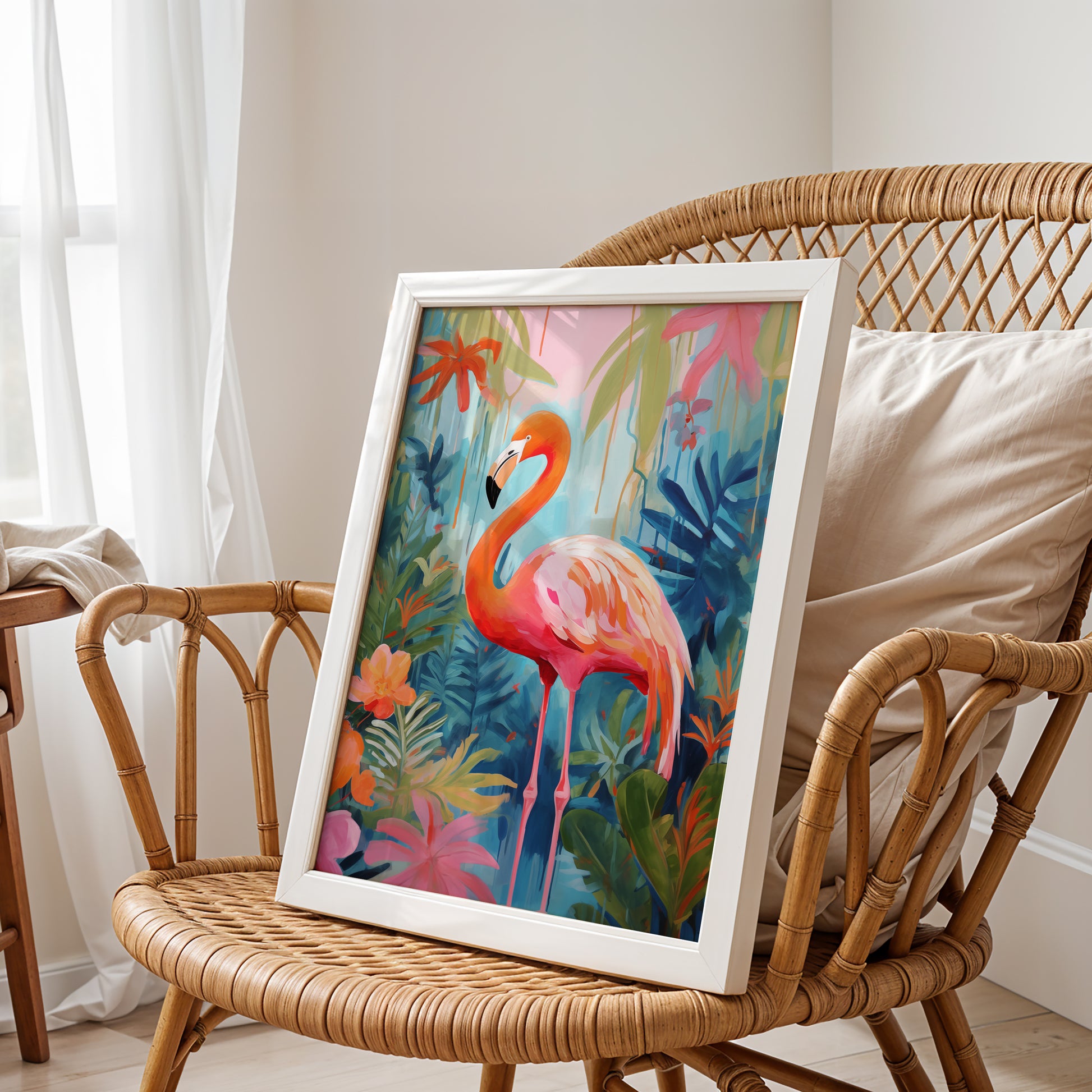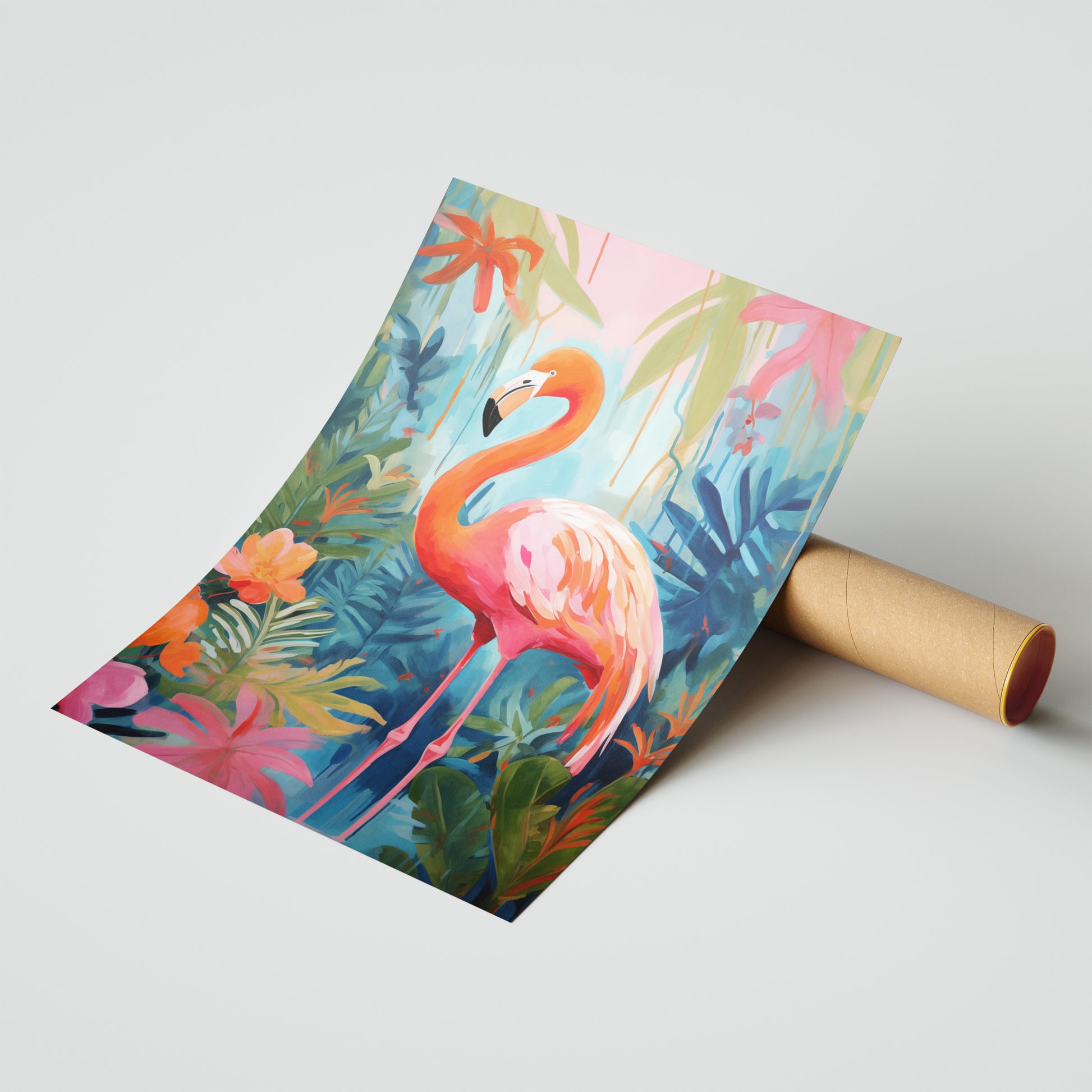 Brighten up your spaces with the vibrant elegance of this dazzling flamingo standing tall amid lush jungly leaves and cheerful coral-pink flowers. Bursting with energetic brushwork and lively color play, this artwork brings instant vacation vibes, making it perfect for bedrooms, sunrooms, or anywhere that deserves a splash of paradise.