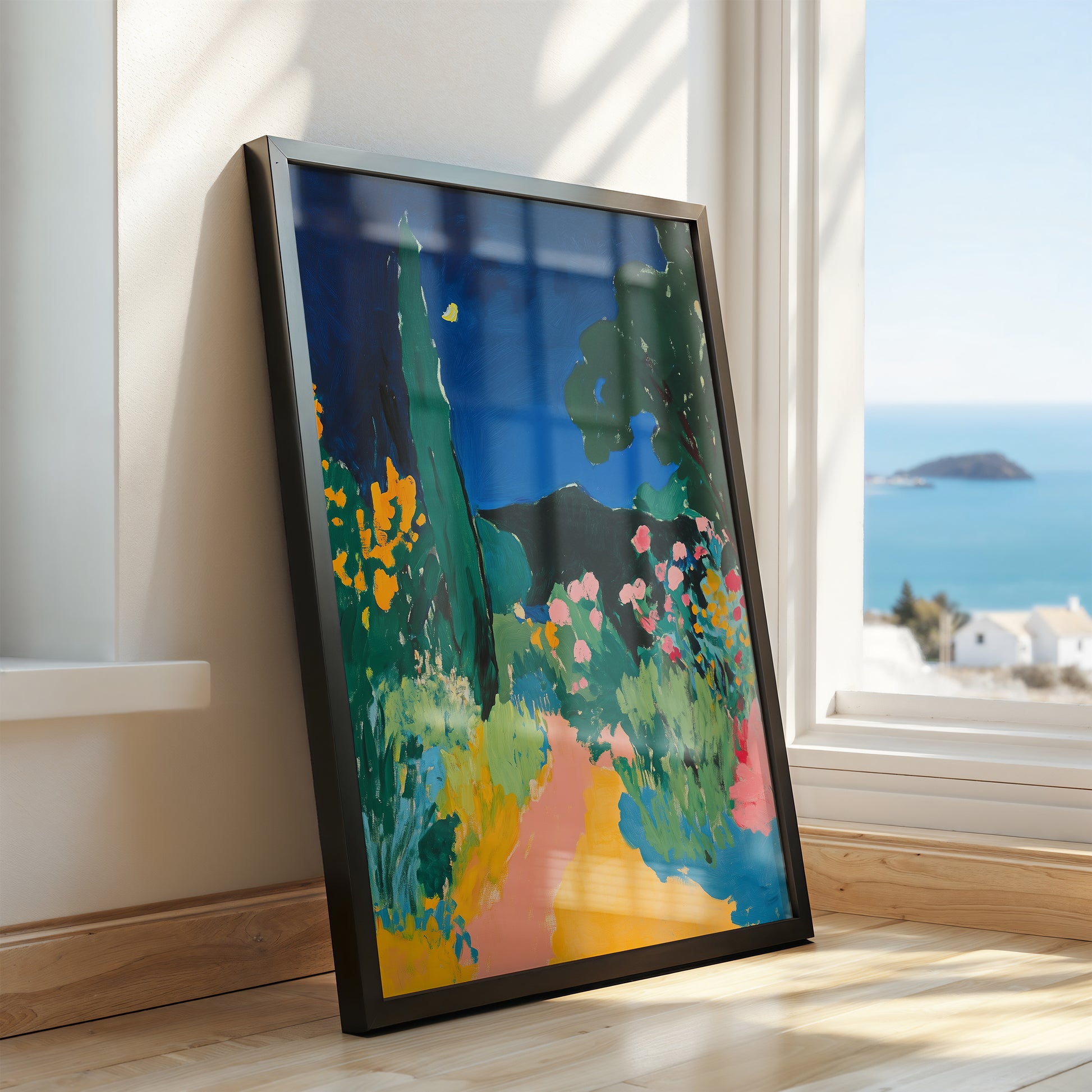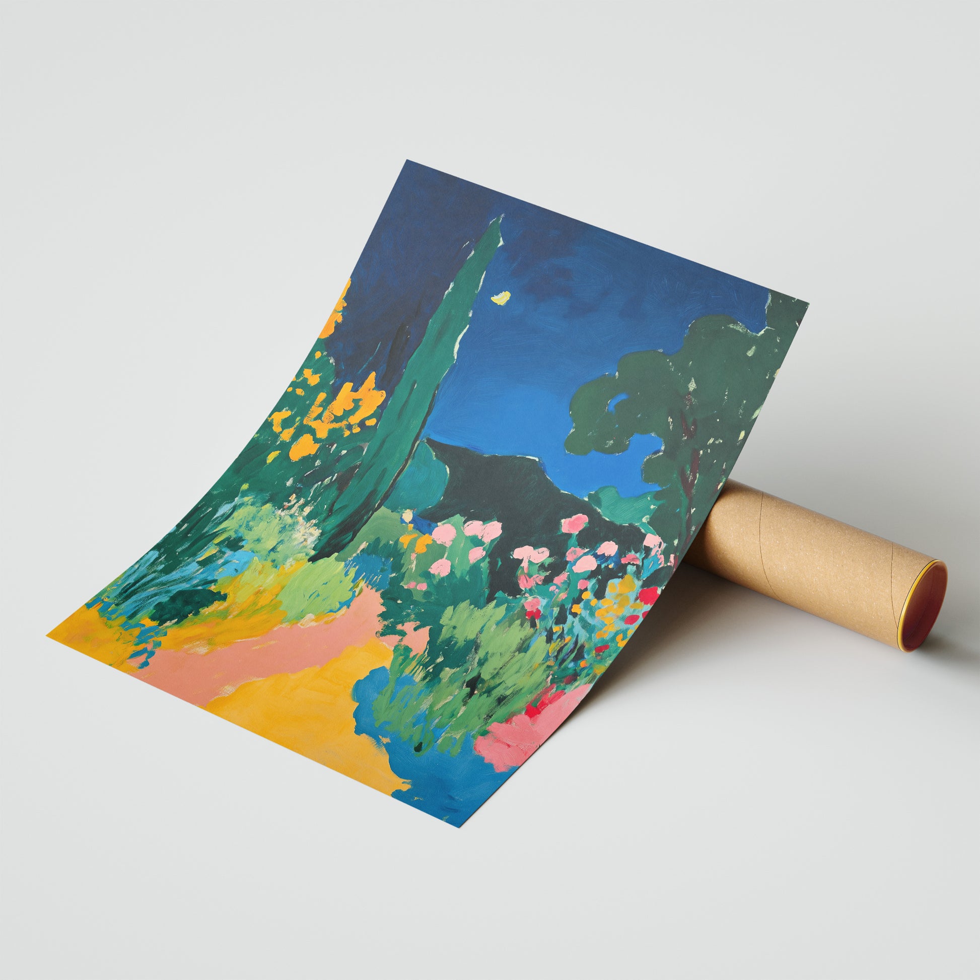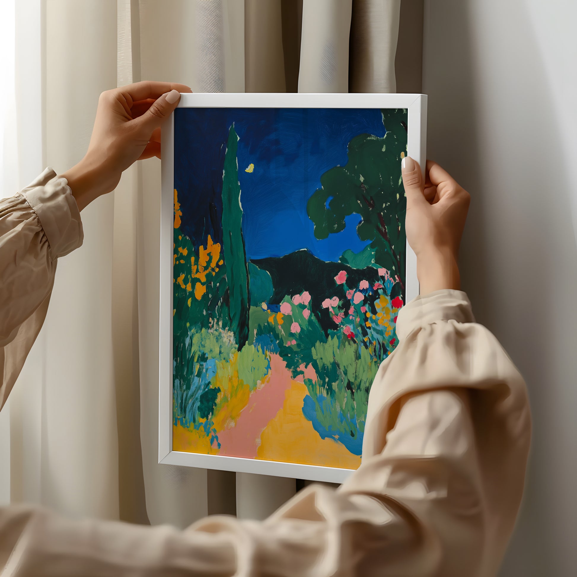 Take a magical walk with "Garden Stroll," a vibrant landscape featuring a sun-dappled path winding through lush greenery and blooming flowers to distant hills beneath a twilight sky. Bold greens, soft pinks, and punchy yellow elements draw the eye along the inviting lane, invoking memories of quiet wanderings and tranquil countryside evenings. This piece brings vitality and adventure to interiors, perfect for hallways, living spaces, or anywhere needing a splash of nature-inspired optimism and dreamlike color.