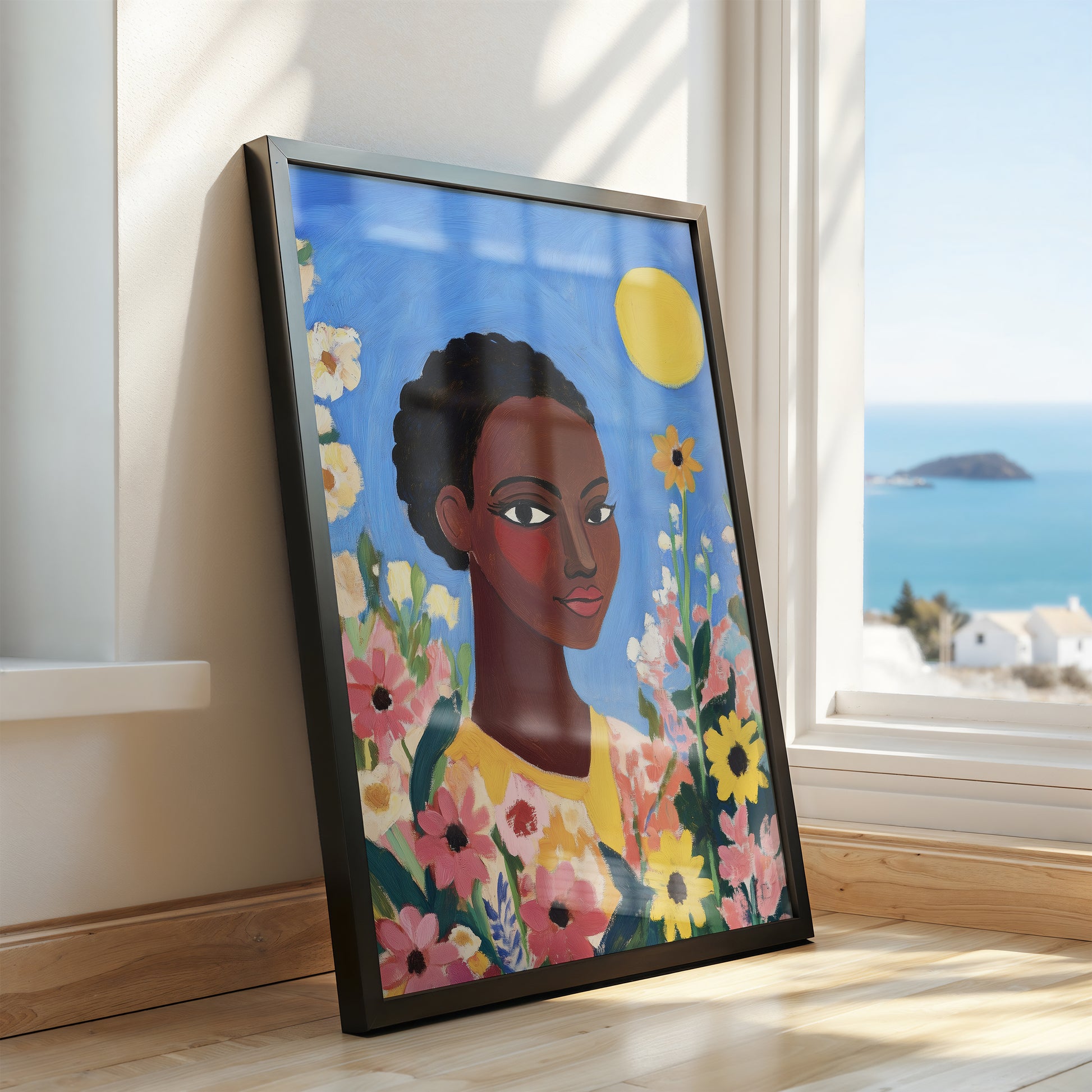 Celebrate individuality with "Golden Sun Muse," an enchanting art poster depicting a poised woman amidst a flourishing field of flowers under a vibrant golden sun. Bathed in brilliant blue and surrounded by bold botanicals, the artwork captures the harmonious blend of self-confidence and natural beauty. The expressive floral bursts and joyful colors invoke feelings of optimism, creativity, and self-love. Ideal for brightening any room, office, or creative space, this poster is a tribute to growth, positive energy, and the timeless power of nature’s muse. Elevate your walls with this radiant and inspiring masterpiece.