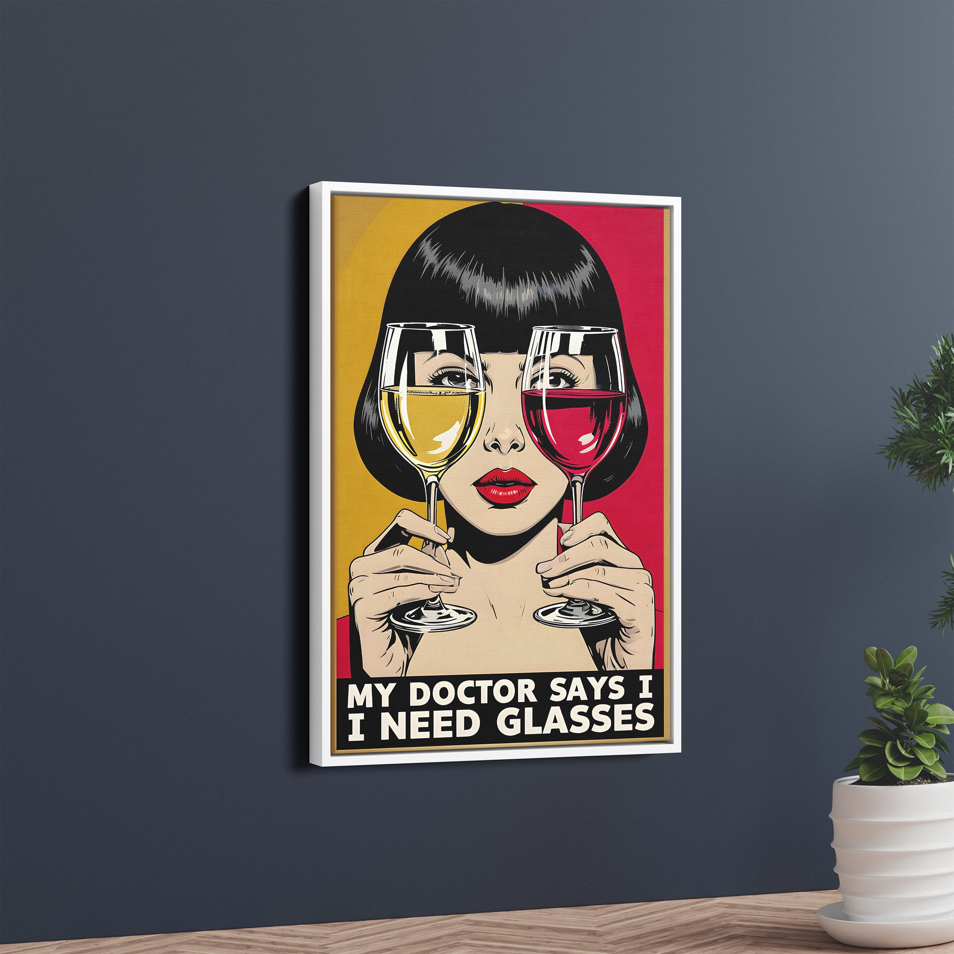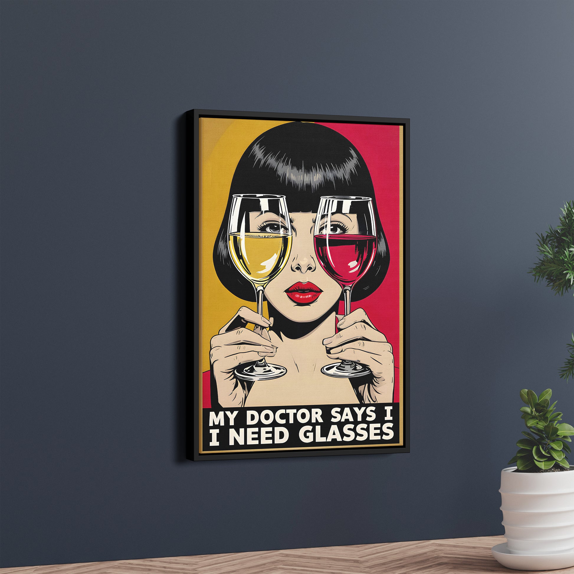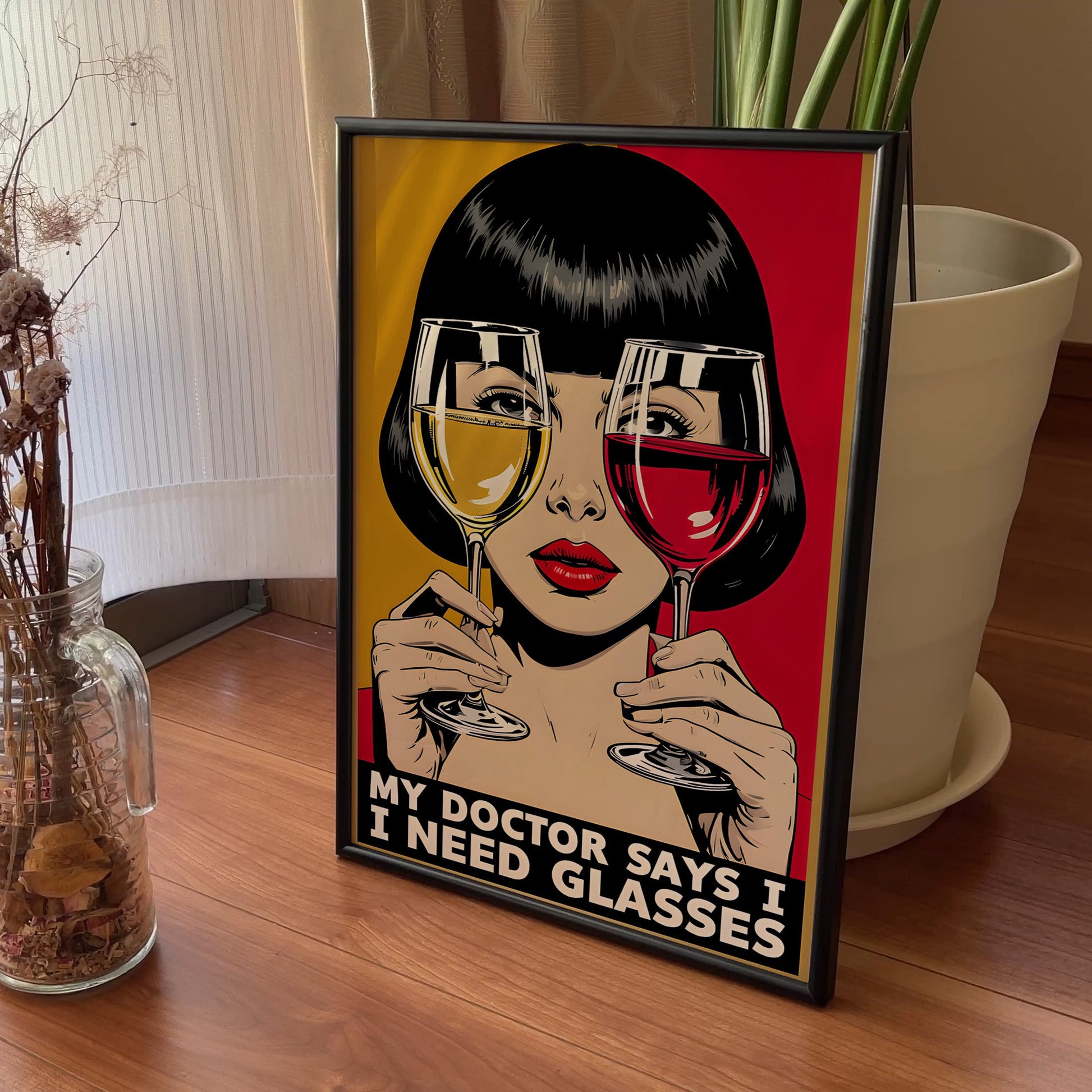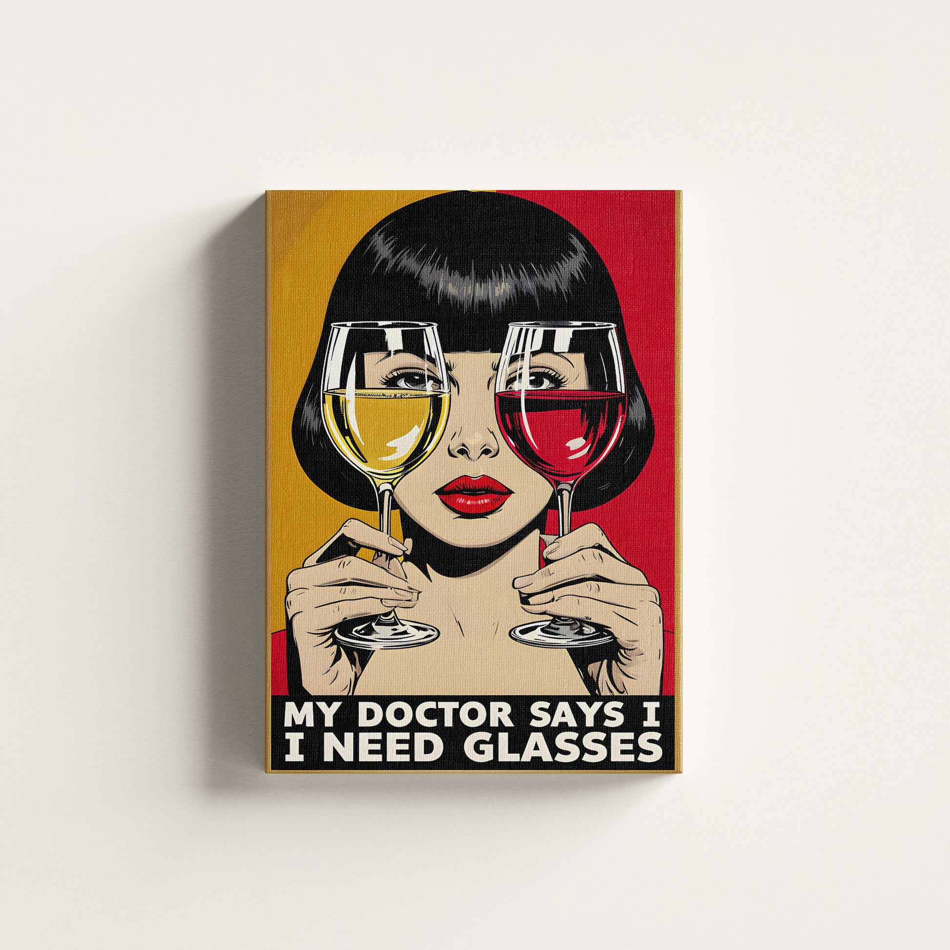 Inspired by the iconic comic book art of the 1960s, this illustration features a stylish woman peering through a glass of red and white wine. The playful caption, "My Doctor Says I Need Glasses," delivers a perfect punchline that's guaranteed to bring a smile. The bold red and yellow colour scheme creates a stunning visual that is both chic and amusing, making it an instant conversation starter.