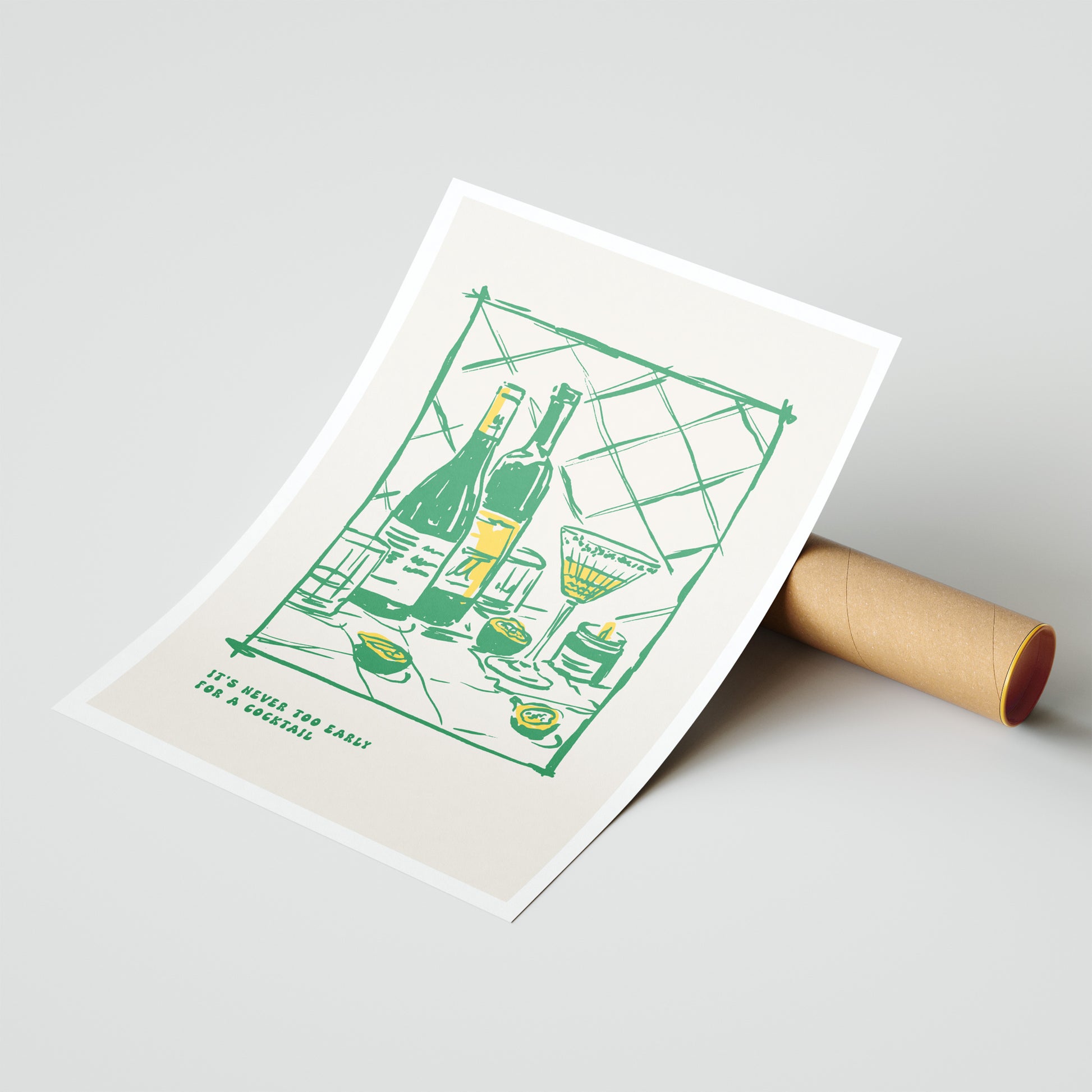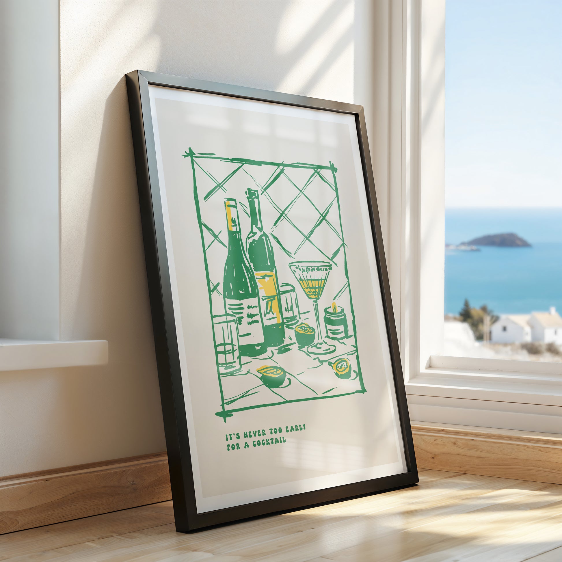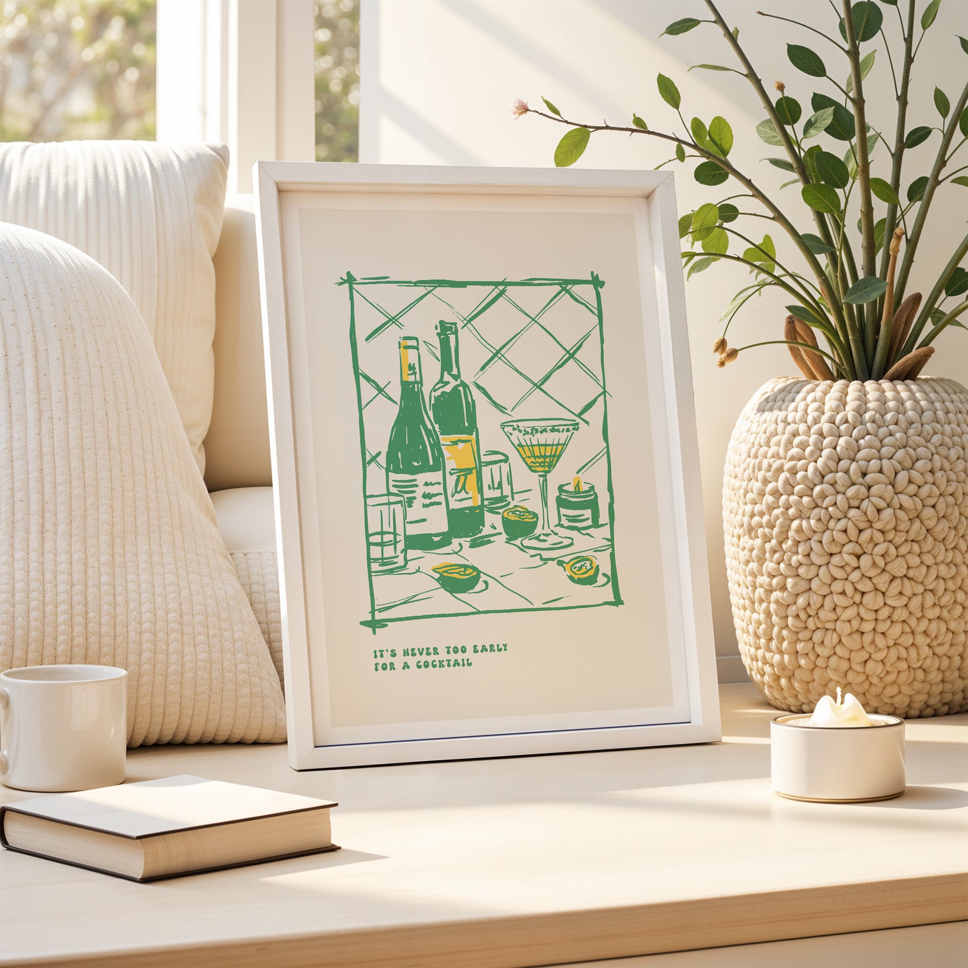 Start your day with a splash of humor and style! This quirky, hand-drawn cocktail-themed art print captures the essence of laid-back luxury with a playful reminder: “It’s Never Too Early for a Cocktail.” Perfect for kitchens, bars, or beach homes, the minimalist line illustration in refreshing green and yellow tones brings a modern vintage charm to your wall.