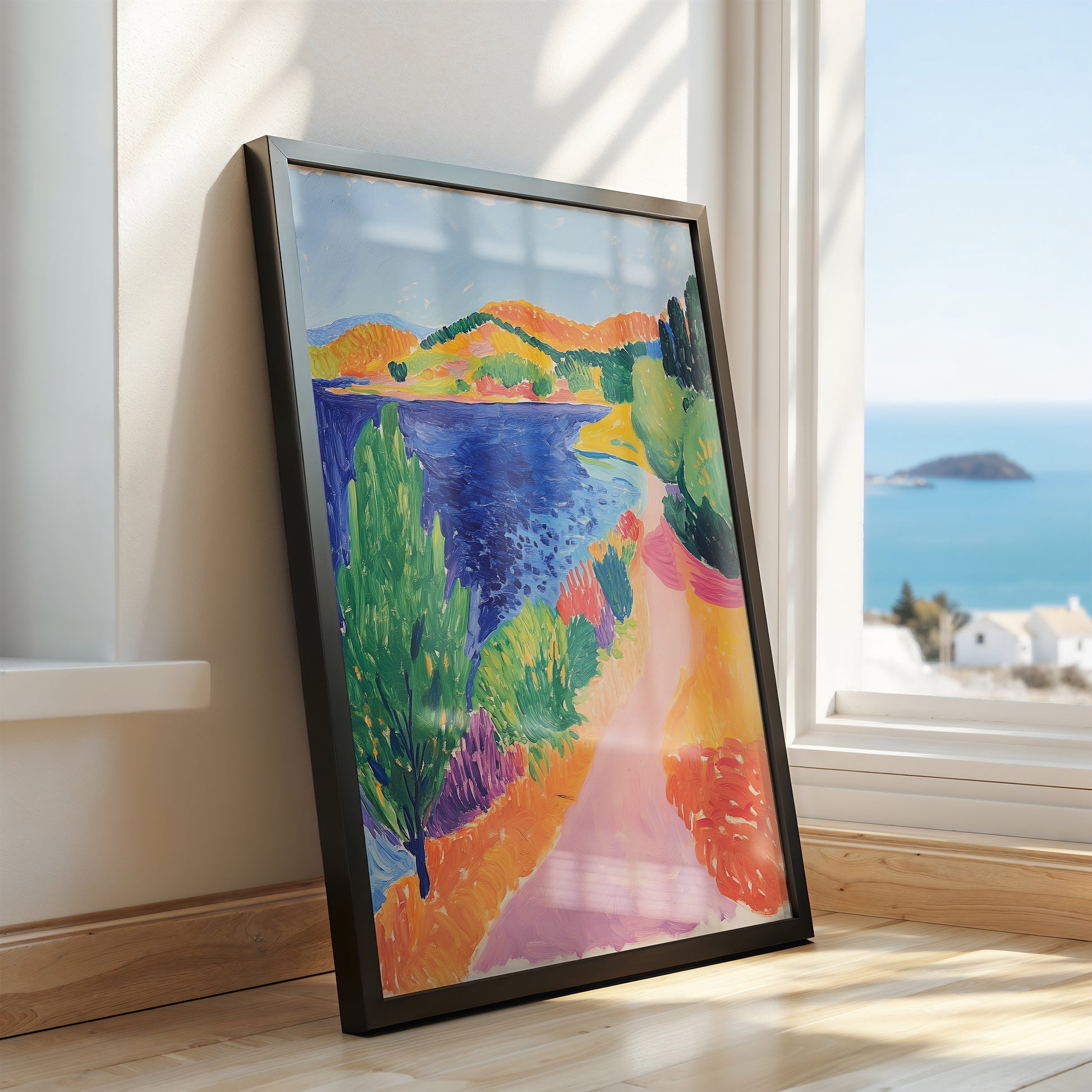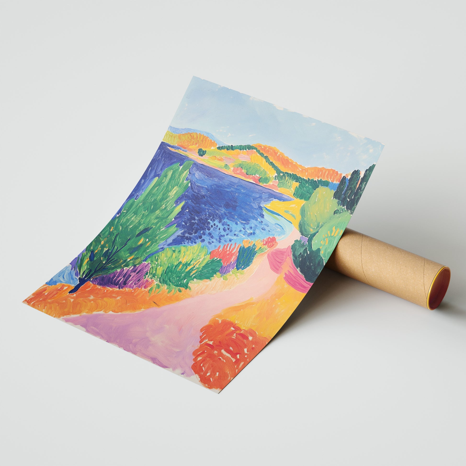 Celebrate nature’s vibrant beauty with "Lakeside Sonata," a lively landscape portraying a winding trail beside a brilliant blue lake, framed by sun-soaked hills and lush foliage. The expressive brushstrokes in tangerine, green, lavender, and cobalt blue evoke the energy of a perfect summer day spent exploring new horizons. This artwork brings adventure and a dynamic splash of brightness to living rooms, offices, or entryways—inviting fresh air and sun into your daily routine. "Lakeside Sonata" is your escape into painted paradise, where every glance inspires wanderlust and joy.
