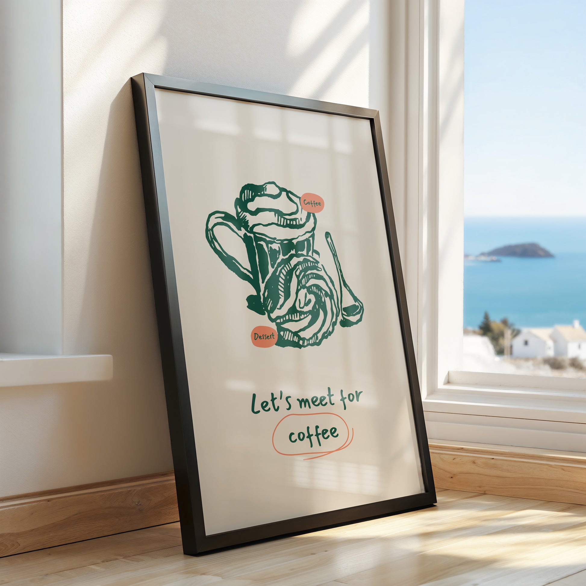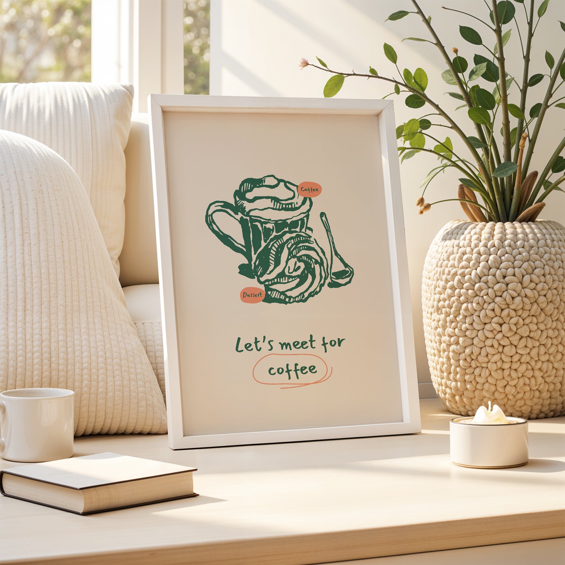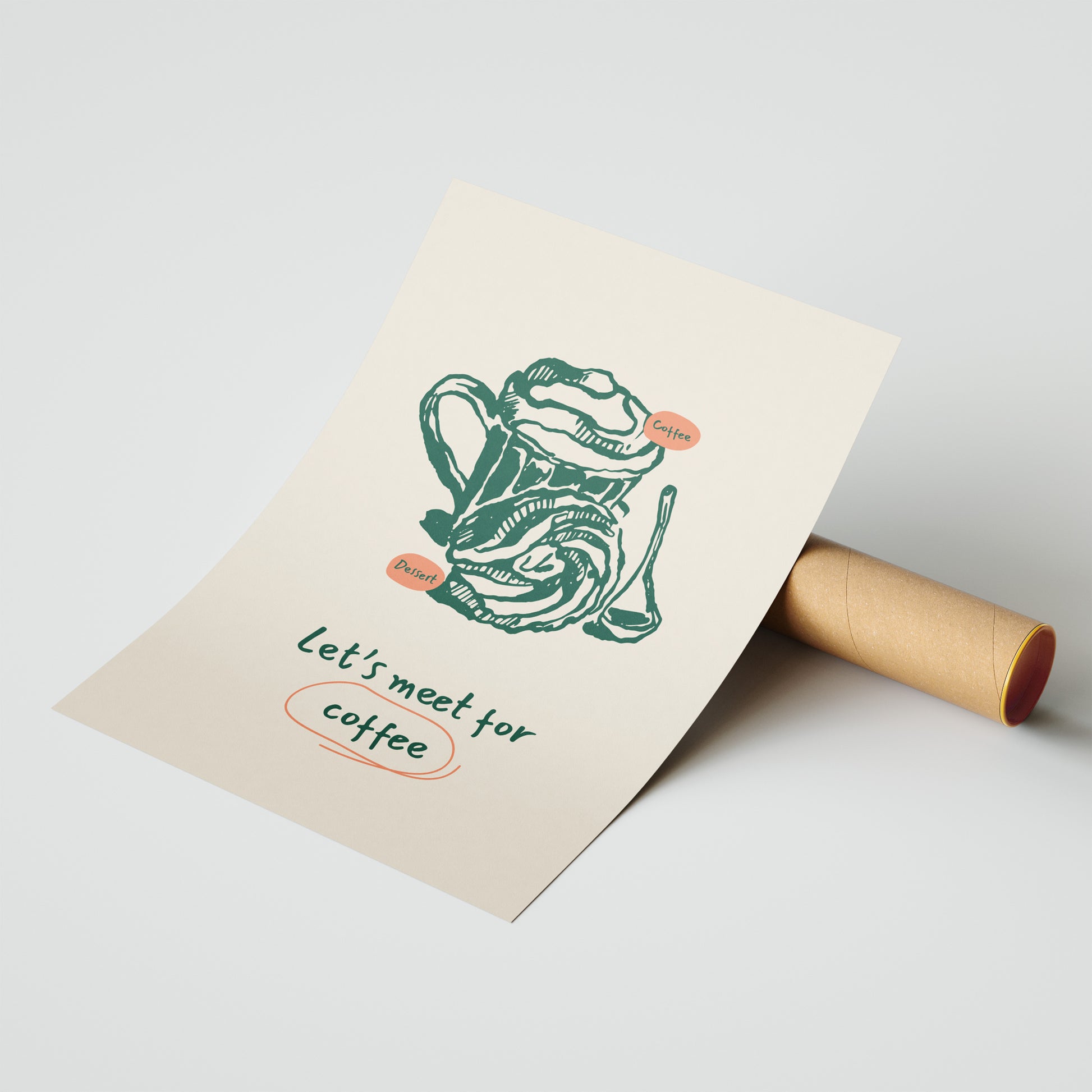 Capture the warm, inviting spirit of a friendly coffee date with this charming art print. An ode to one of life's best invitations, this piece features a delightful illustration of a frothy cup of coffee paired perfectly with a sweet pastry, ready to be shared. The artwork's cozy, graphic style is rendered in a rich deep green, complemented by warm orange accents.