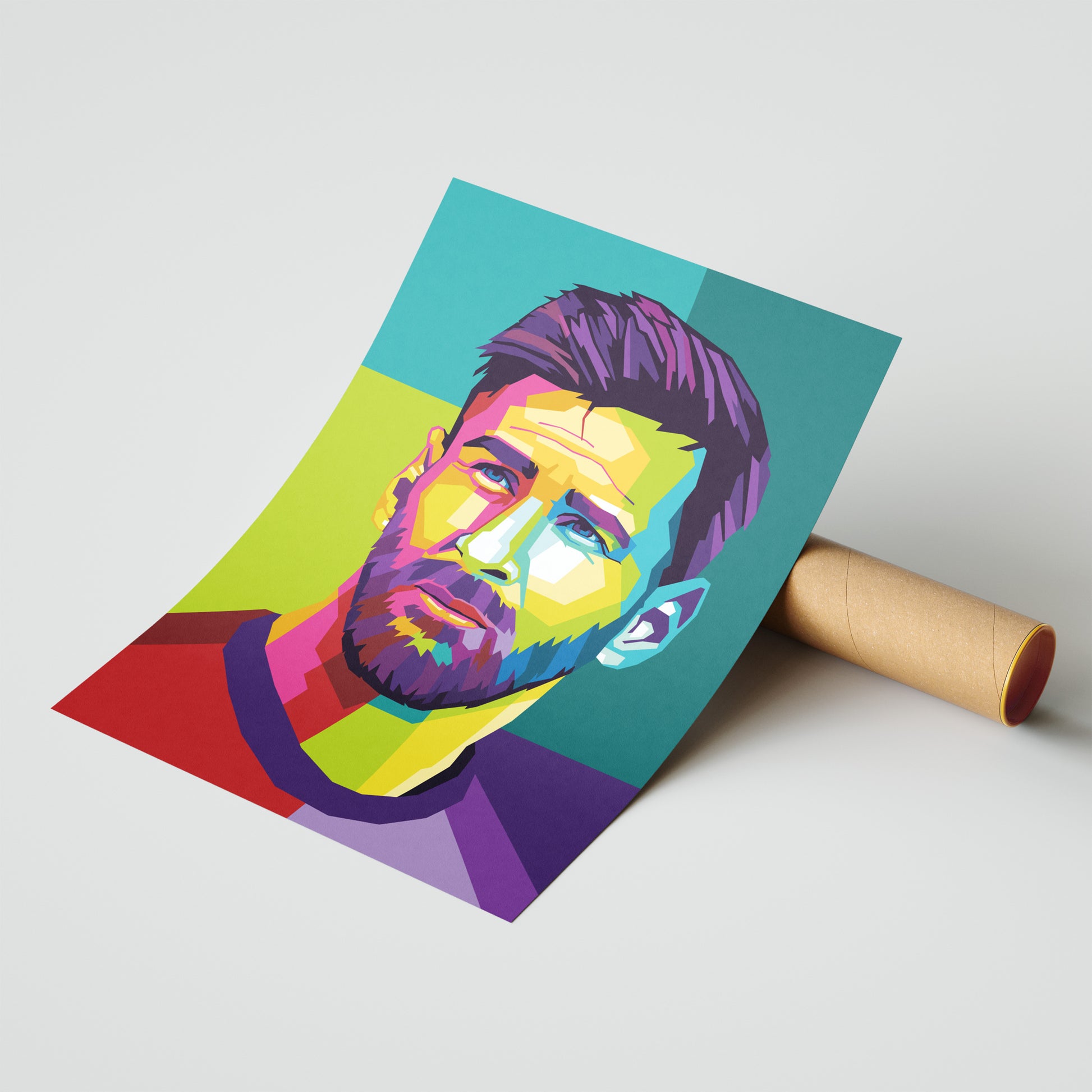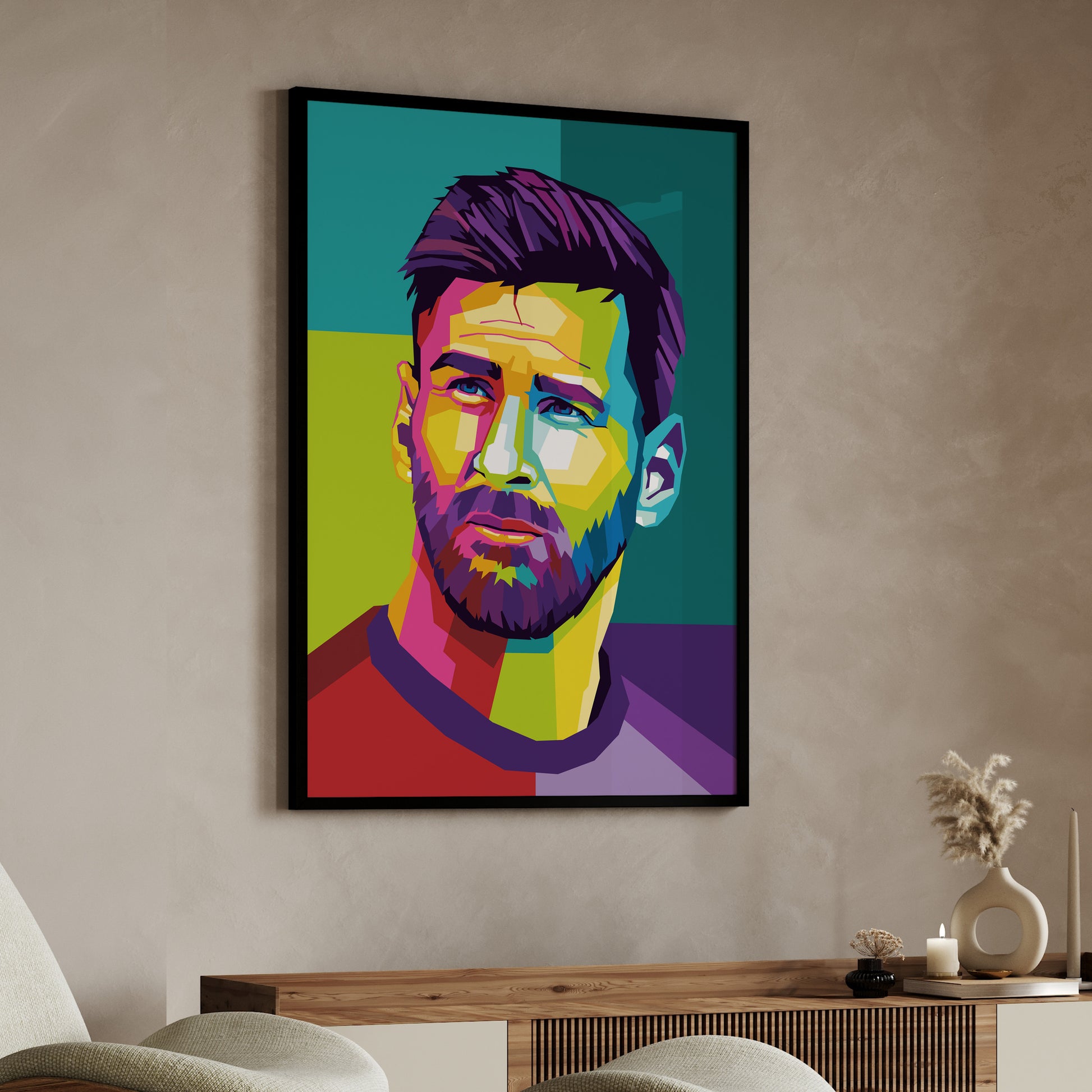 A pop art poster of Messi showcases the Argentine soccer player in a vibrant and eye-catching manner, with exaggerated features and a dynamic pose. The bold colors and graphic elements in the background add to the playful and energetic atmosphere of the artwork.