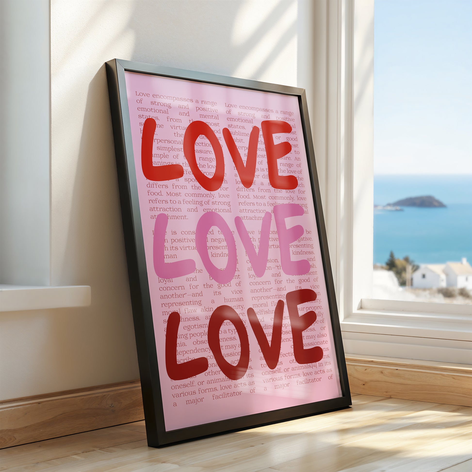 Say it once, say it twice, say it three times for effect. This graphic art print is a bold, modern, and energetic celebration of love. Featuring the word "LOVE" repeated in vibrant shades of red and pink, the layered typography creates a dynamic, eye-catching effect with a cool, pop-art vibe.