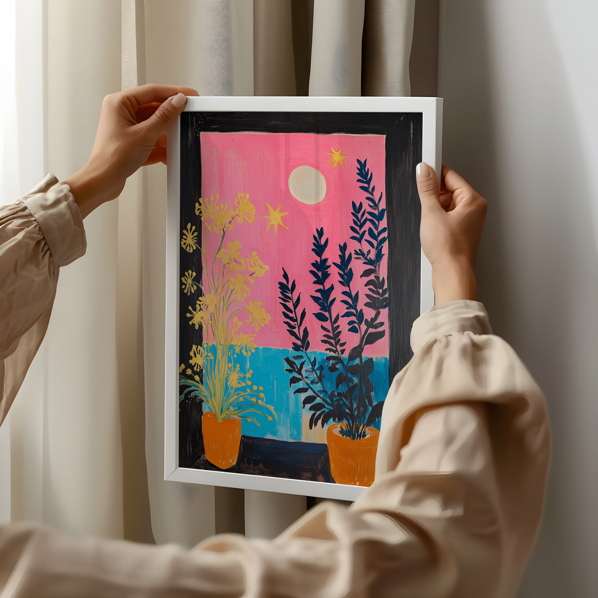 "Moonlit Balcony" captures a moment of serene beauty, blending still life with a tranquil seascape. Two potted plants, one with delicate yellow flowers, are silhouetted against a stunning view. A full moon and tiny stars illuminate the vibrant pink sky, which meets a calm, deep blue sea. This Post-Impressionist piece evokes a sense of peace and quiet contemplation, perfect for creating a window to a dreamlike world in your own space.