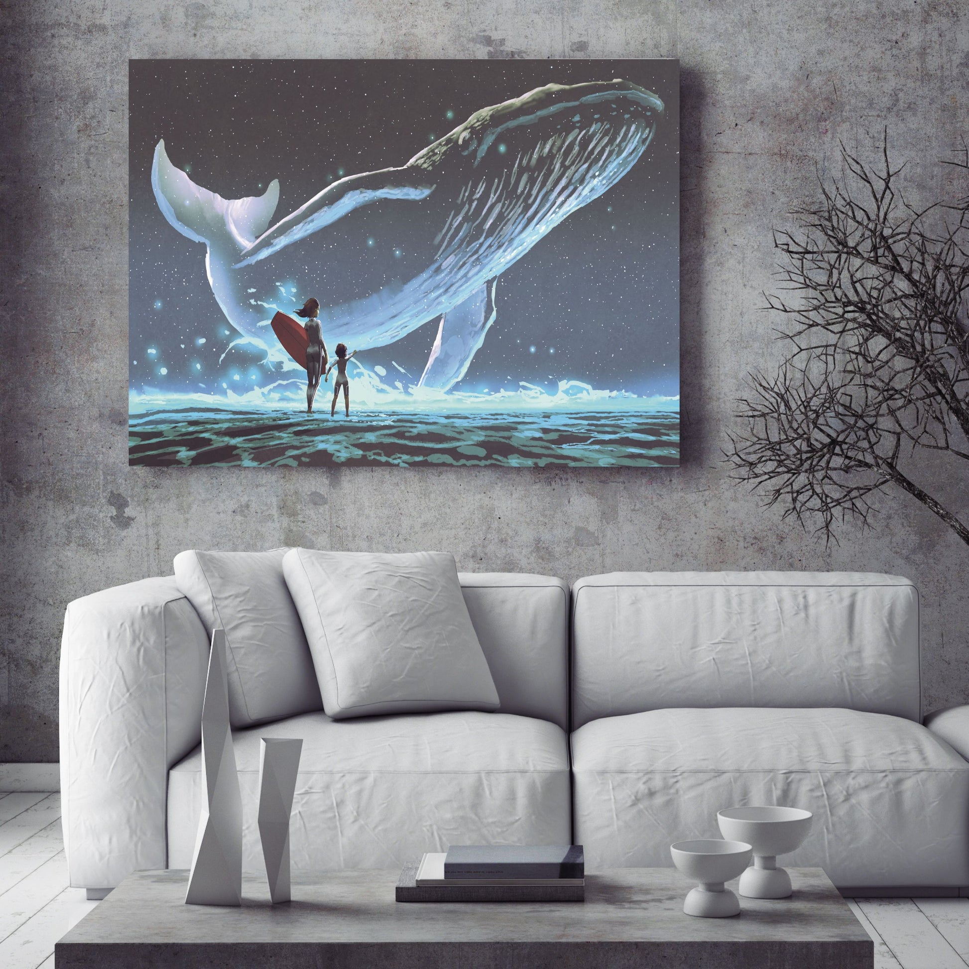 Mother and daughter looking at the whale with blue light flying in the night sky