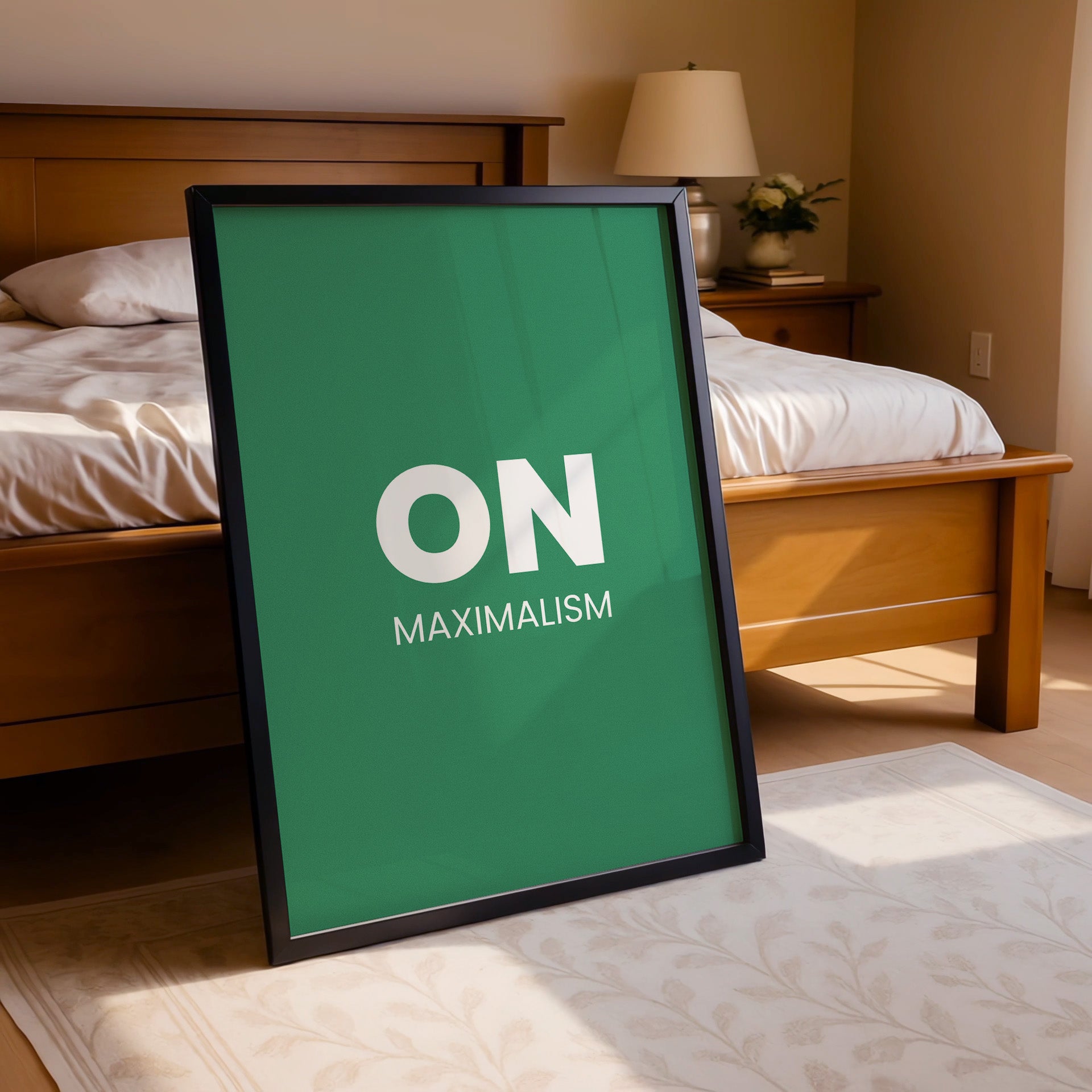 Showcase your love for bold design with “On Maximalism.” This modern artwork features a striking monochrome green background with crisp, oversized text, making an unapologetic declaration of style. Ideal for creative studios, statement walls, or anywhere a maximalist spirit thrives.