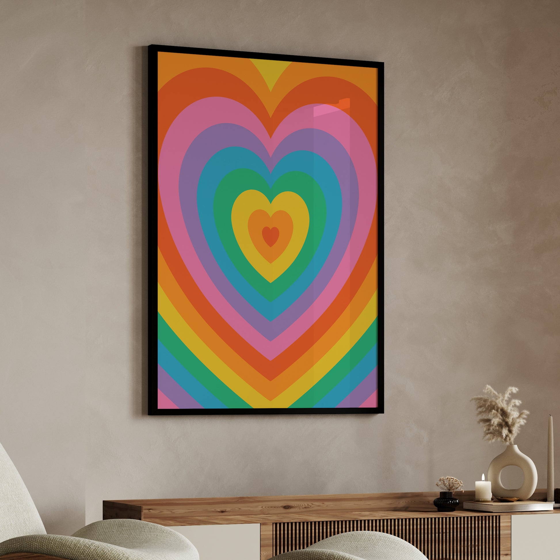 Add vibrant positivity to your space with this bold psychedelic art poster, featuring radiating concentric hearts in every color of the rainbow. Perfect for celebrating love, joy, and expressive individuality, the retro-inspired artwork brings cheerful energy and a nostalgic ’70s vibe.