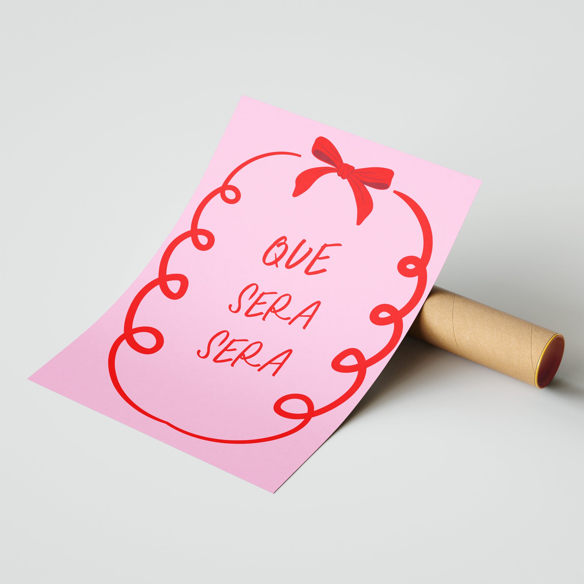 Embrace whatever comes your way with this charming “Que Sera Sera” art piece. Playful scarlet hand-lettering is elegantly framed with a swirling red ribbon and bow, all set on a cheerful pink backdrop. Offering a gentle reminder to trust in the journey and let life unfold, it’s perfect for bedrooms, offices, or any space where a dash of carefree optimism is always welcome.