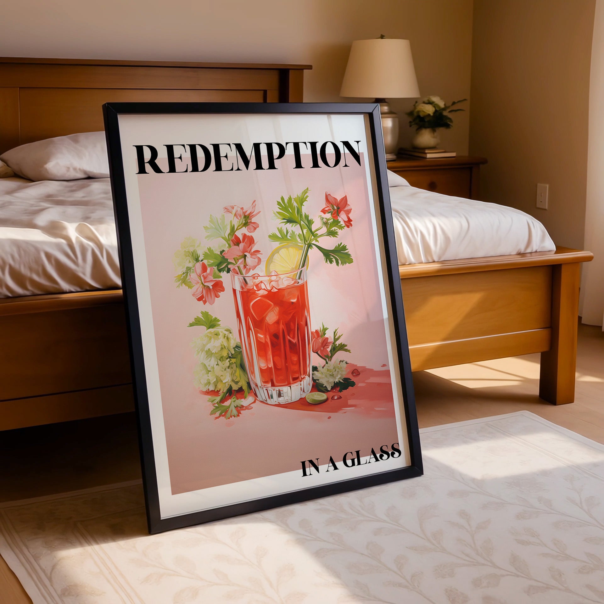 Refresh your décor with this lively “Redemption in a Glass” art print. Featuring a lush, garnished cocktail surrounded by playful florals, this piece radiates celebration and rejuvenation. Perfect for bar carts, kitchens, or dining spaces where a good drink and good vibes are always in style.