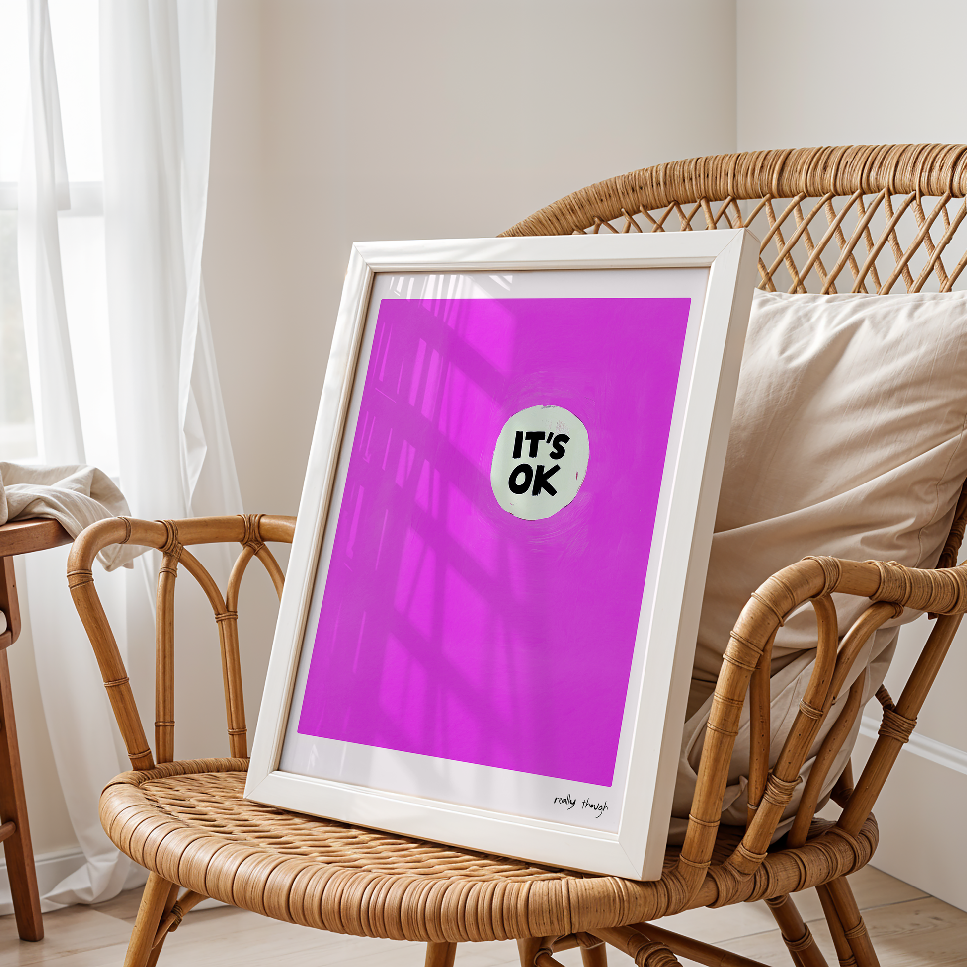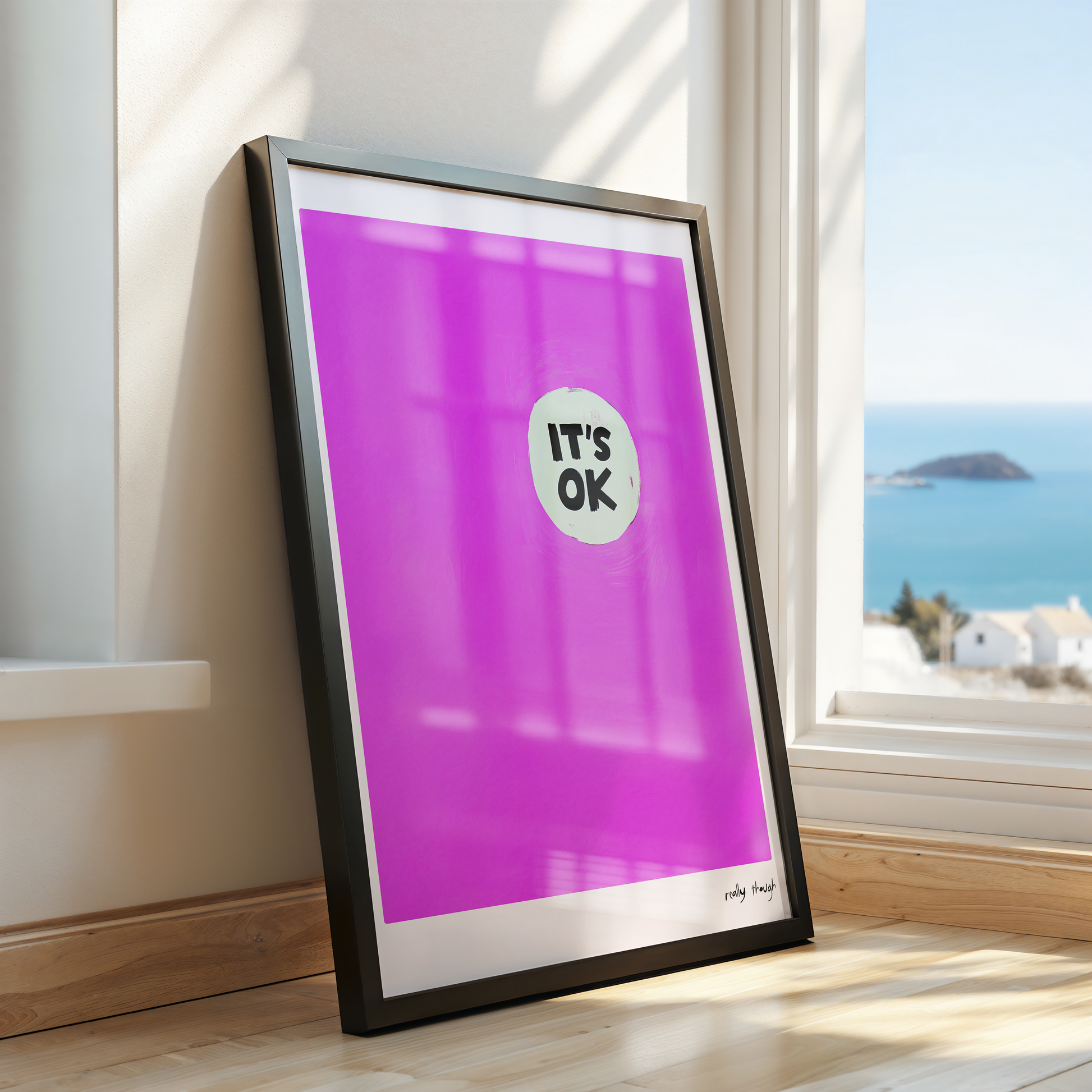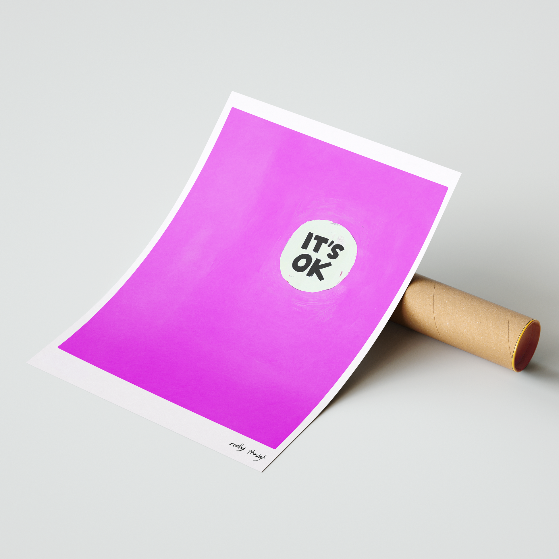 Channel calm, resilience, and minimalist design with "Risky Thought: It’s OK," a modern pop-style poster from the Dopamine Gallery collection. Featuring a single hand-brushed disc proclaiming “IT’S OK” at the center of a radiant magenta field, this piece radiates reassuring energy and understated boldness. Perfect for bedrooms, therapy spaces, studios, or any corner that needs a dose of daily reassurance and gentle style, "It’s OK" is a reminder that life’s ups and downs are all part of the journey—and everything will work out in the end. Let your wall be a quiet source of comfort and strength, every single day.