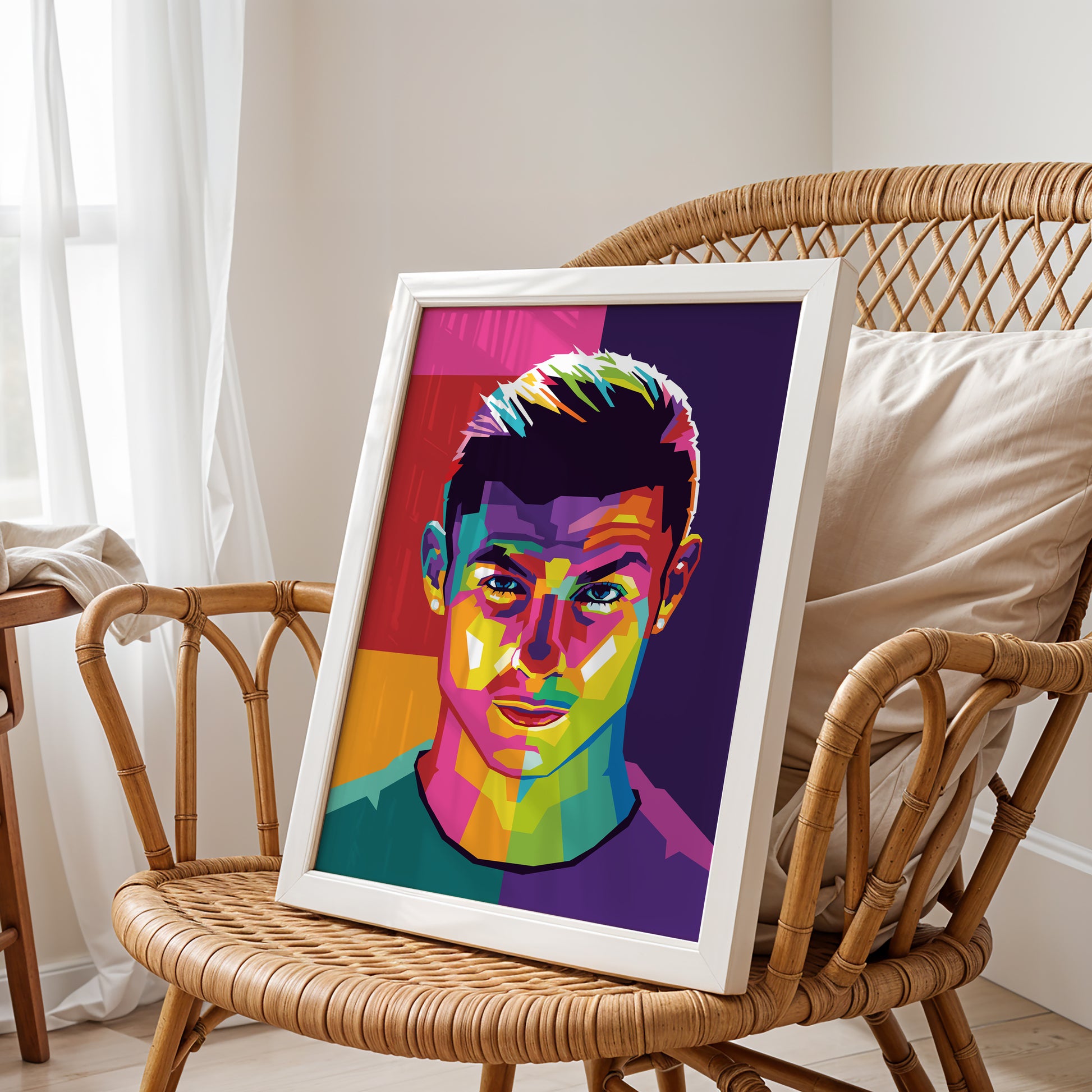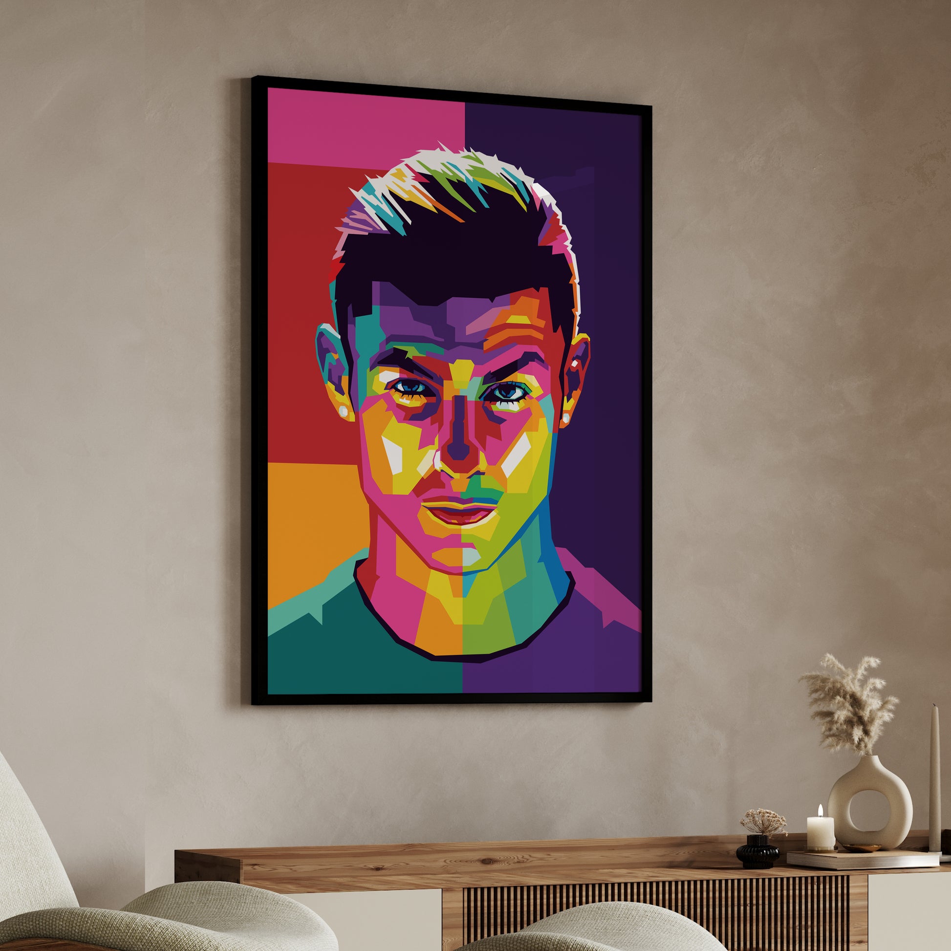 A pop art poster of Ronaldo depicts the soccer superstar in a bold and colorful style, with exaggerated features and a dynamic pose. The background is filled with vibrant patterns and graphics, adding to the playful and energetic atmosphere of the artwork.