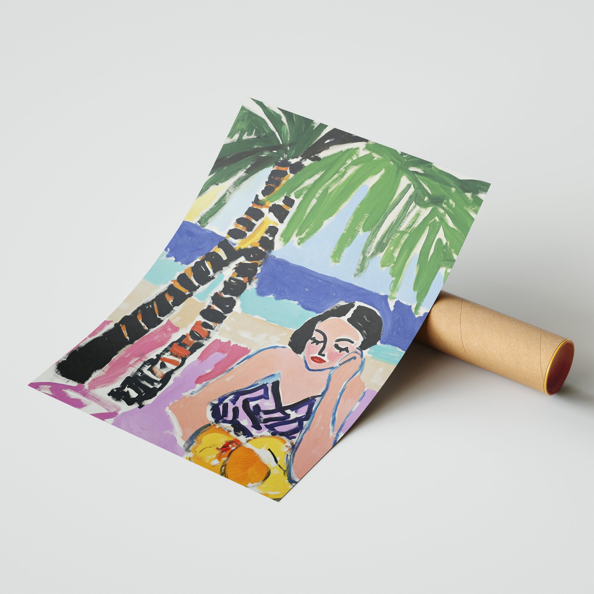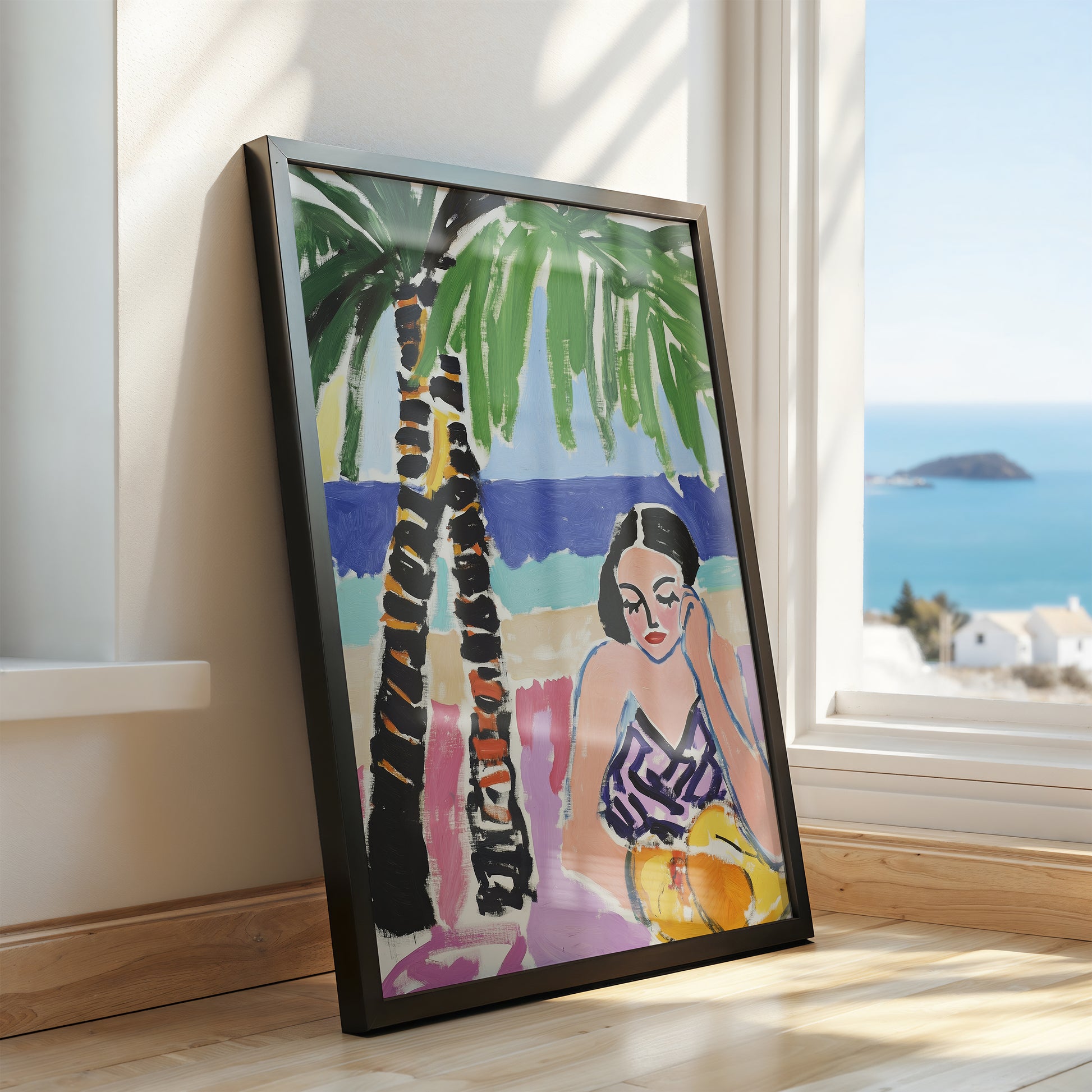 "Shade by the Shore" is a chic Post-Impressionist portrait capturing a moment of seaside repose. A woman in a stylish, patterned swimsuit rests in the bold, expressive shade of a large palm tree, her contemplative gaze adding a touch of mystery. The vibrant pinks of her seat contrast with the deep blue sea behind her, creating a sophisticated and colorful composition that evokes the heat of the day and the cool of the shade.