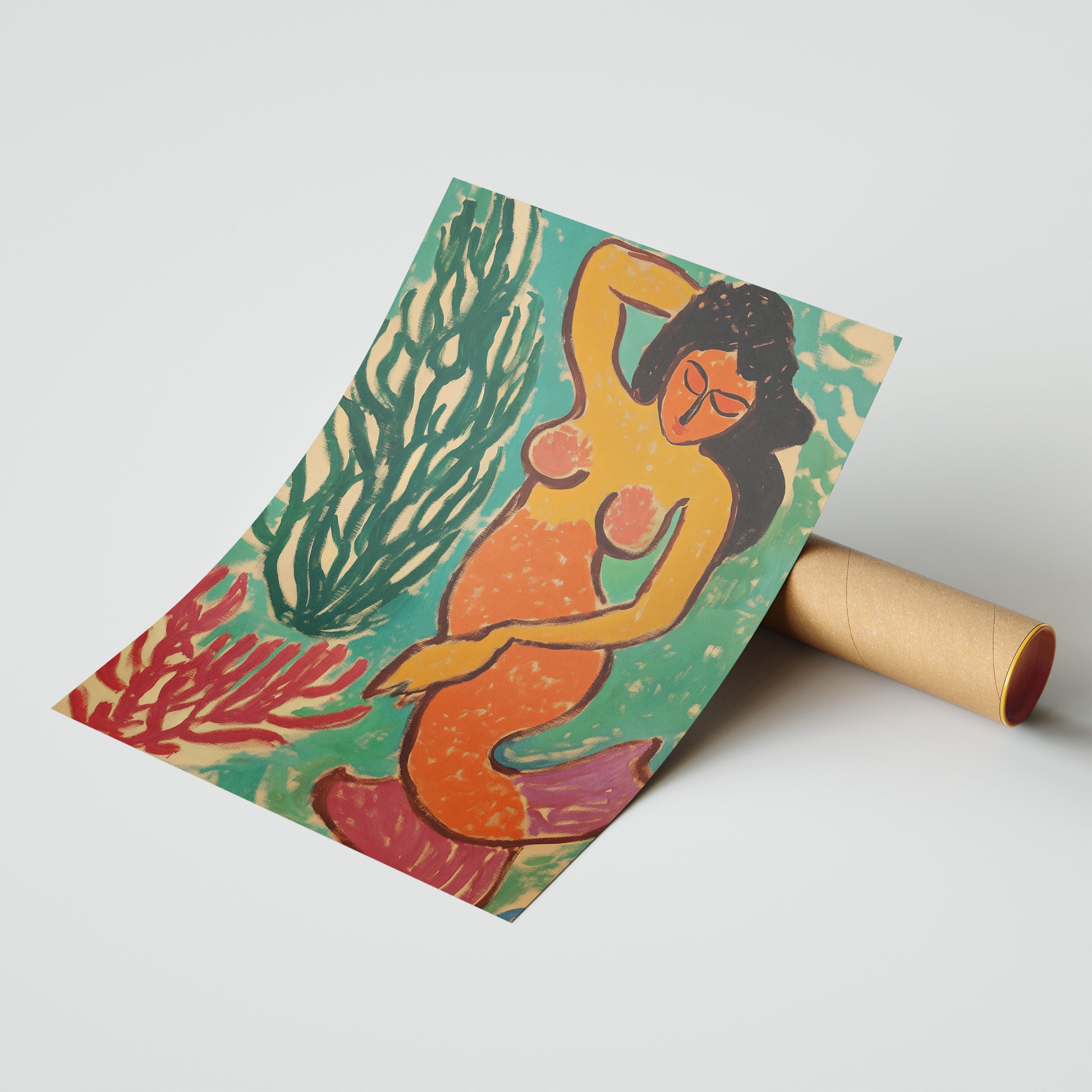 Immerse yourself in whimsy with "Siren’s Serenity," a captivating artwork featuring a graceful mermaid with flowing black hair lounging amidst lush underwater foliage. Bold lines and warm coral, gold, and green tones create a dreamy, fantastical world that blends mythology with playful abstraction. The mermaid’s relaxed pose, coupled with vibrant seagrass, invites the viewer to daydream about oceanic mysteries and mythical realms. Ideal for adding personality and allure to eclectic spaces, bedrooms, or creative nooks, this poster enchants with its sense of movement, color, and unapologetic wonder.