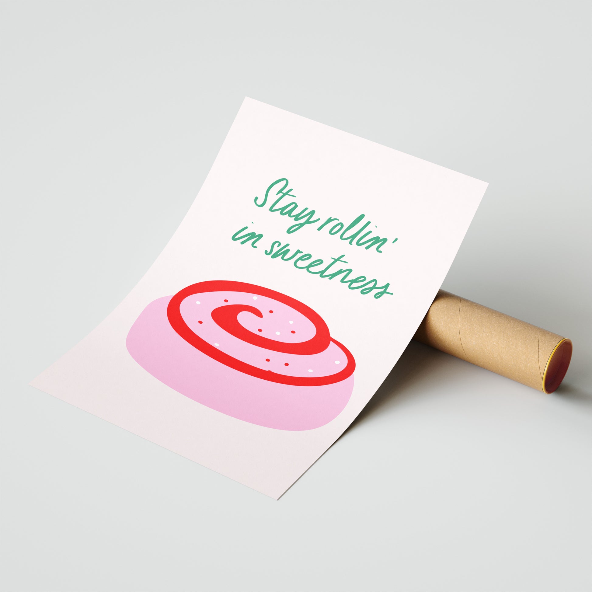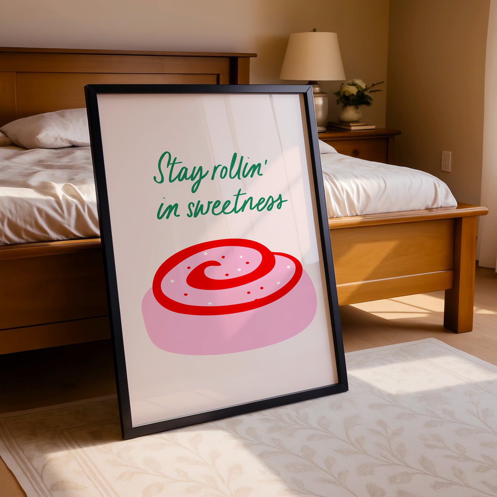 Indulge your senses with this delightful "Stay Rollin' in Sweetness" poster, featuring an adorable cinnamon roll illustration and uplifting typography. Ideal for kitchens, cafes, or cozy corners, this print combines charm and motivation, reminding everyone to keep life sweet. Comes in a quality frame, making it an instant treat for your wall.