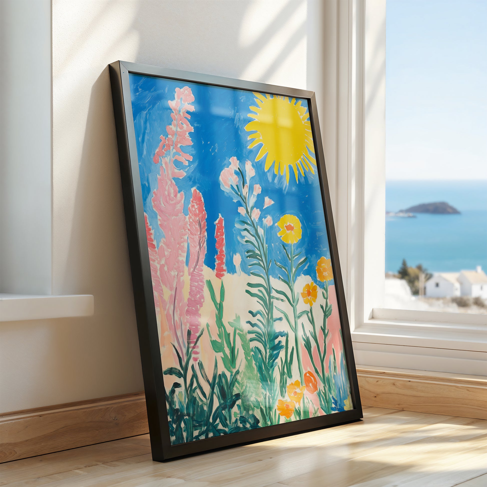 Celebrate the joyous spirit of a summer day with "Summer Meadow Sunshine." This Post-Impressionist floral poster bursts with lively colors, showcasing a meadow filled with an array of whimsical flowers under a bright, radiant sun. The dynamic brushstrokes and vibrant palette capture the essence of a blooming garden, bringing a fresh, cheerful, and uplifting atmosphere to your home or office.