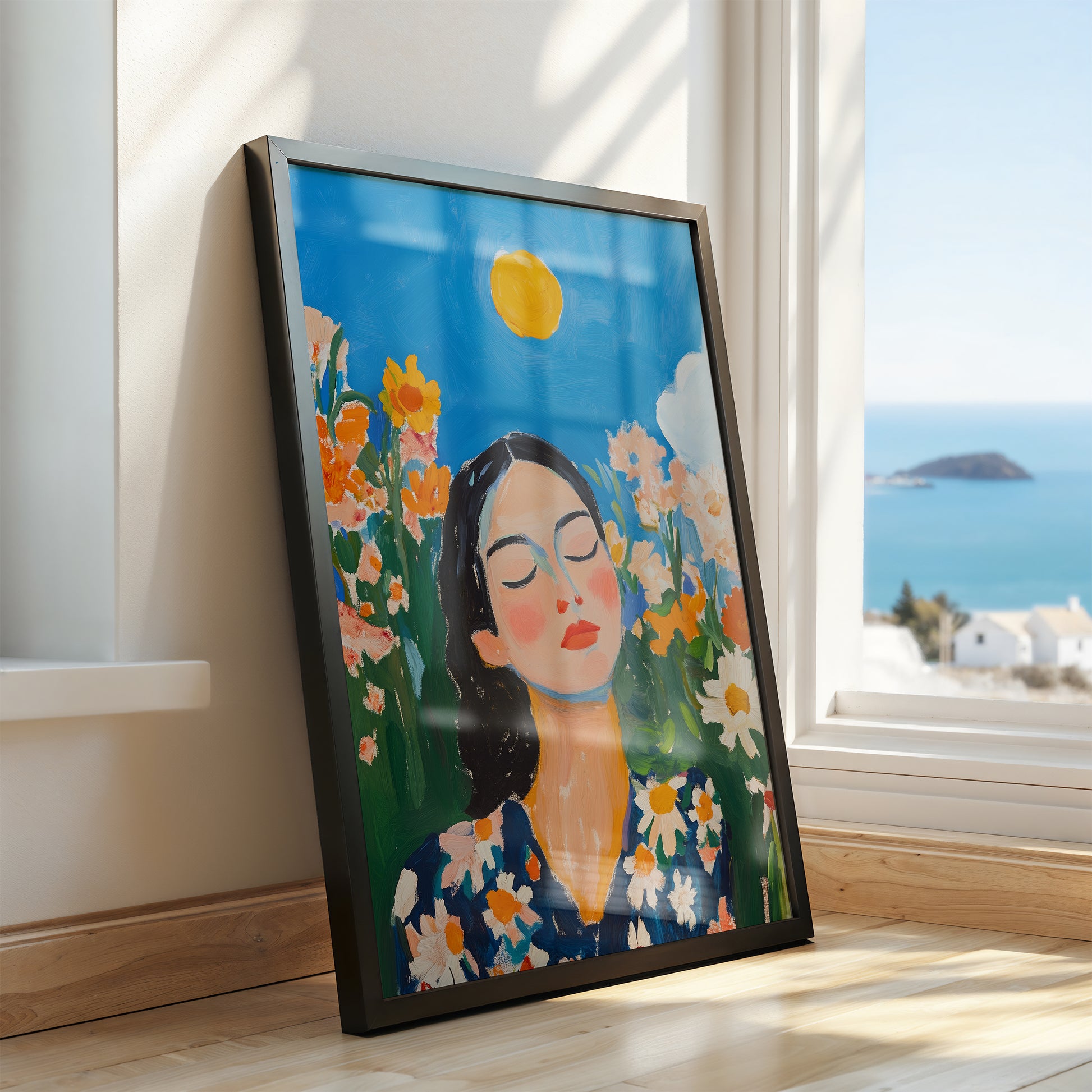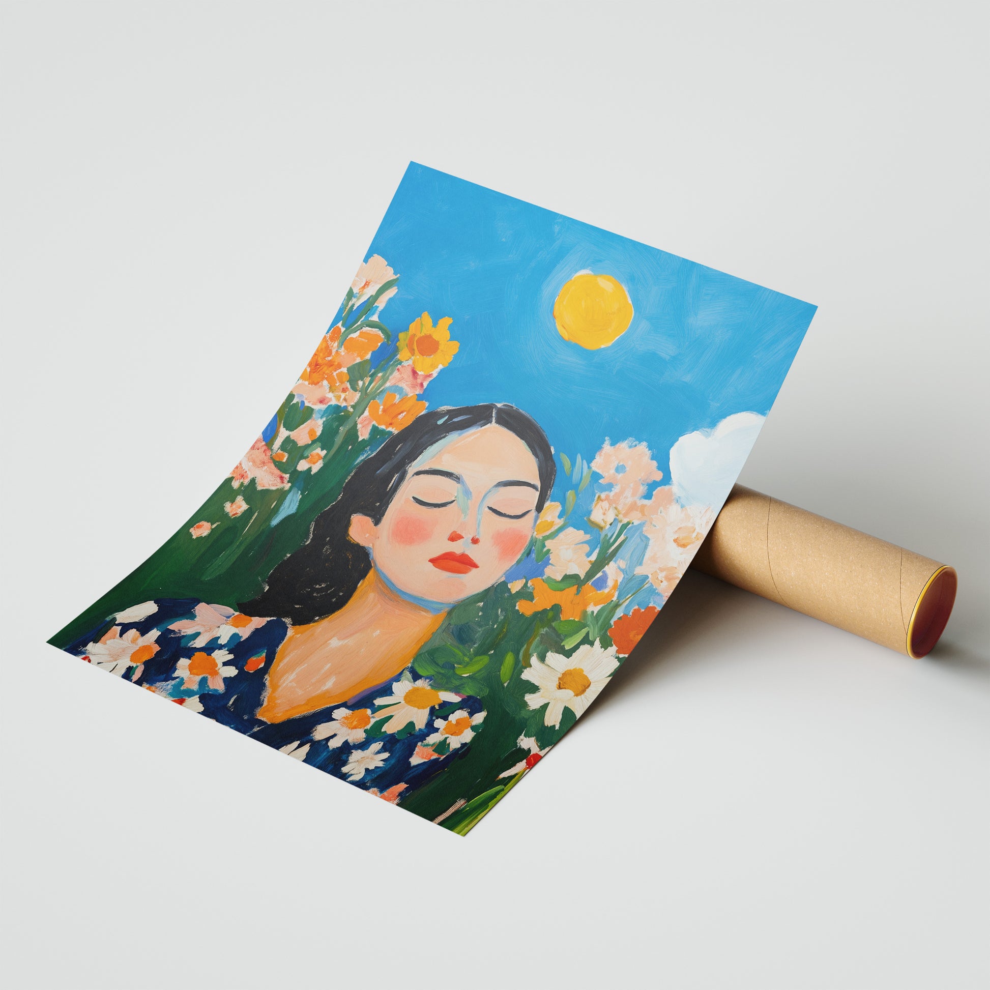 "Sun-Kissed Serenity" beautifully captures a moment of pure, peaceful bliss. This Post-Impressionist portrait features a woman with eyes closed, her face turned toward the warmth of a golden sun. She is immersed in a vibrant field of wildflowers, her daisy-patterned dress blending seamlessly with the surrounding nature. This artwork is a perfect reminder to pause and find joy in a simple, sunlit moment.