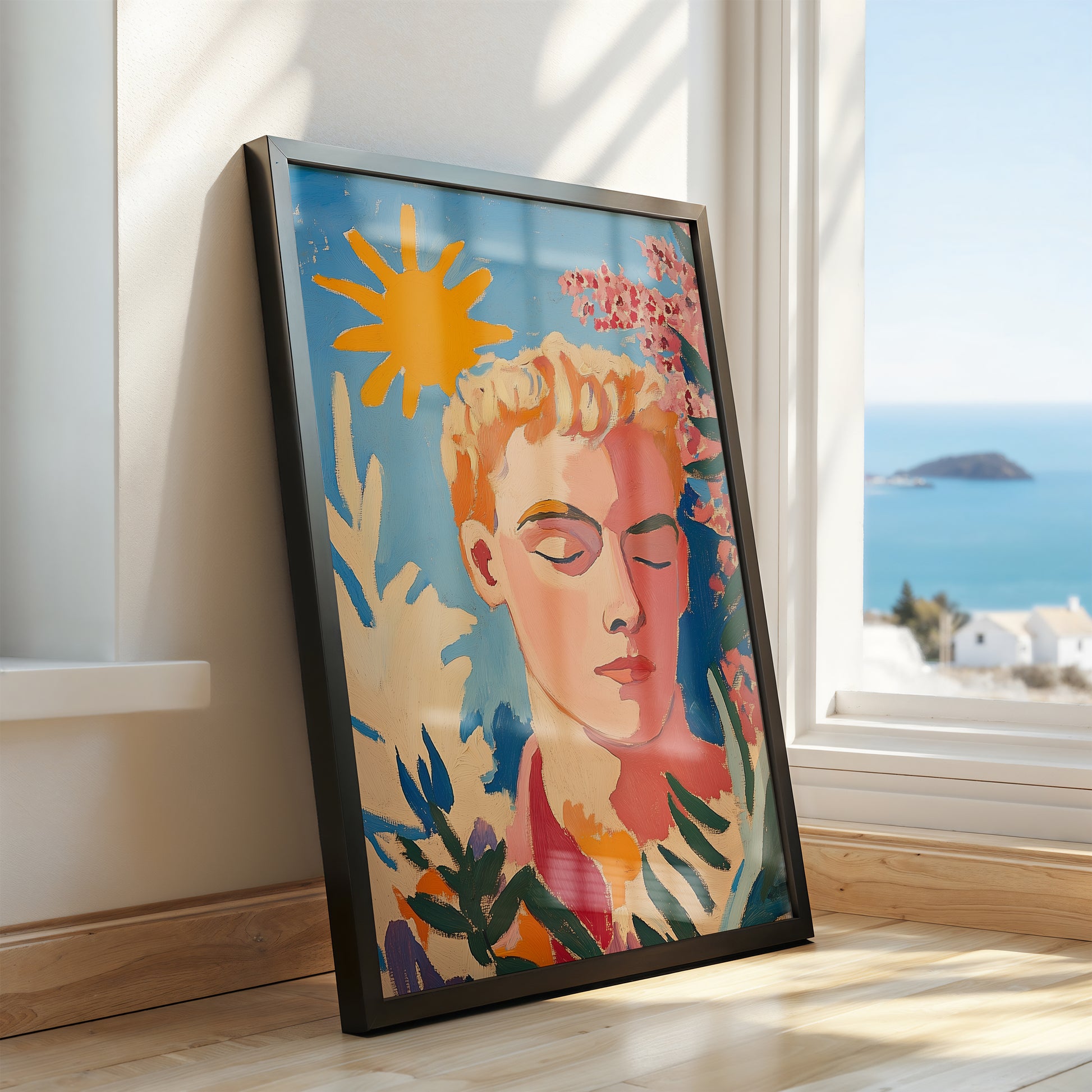 Bring a boost of brilliant energy to your space with "Sunlit Dreamer," a striking art poster showcasing a lively portrait set against bold botanicals and a radiant yellow sun. Awash in energetic brushstrokes, vivid blue sky, and bursts of expressive color, this artwork celebrates cheerful optimism and individuality. The fusion of abstract floral motifs with the playful gleam of sunlight creates a mood of creativity and pure joy. Perfect for brightening up living areas or creative studios, this piece radiates positivity and makes a statement of self-expression and wonder wherever it is displayed.
