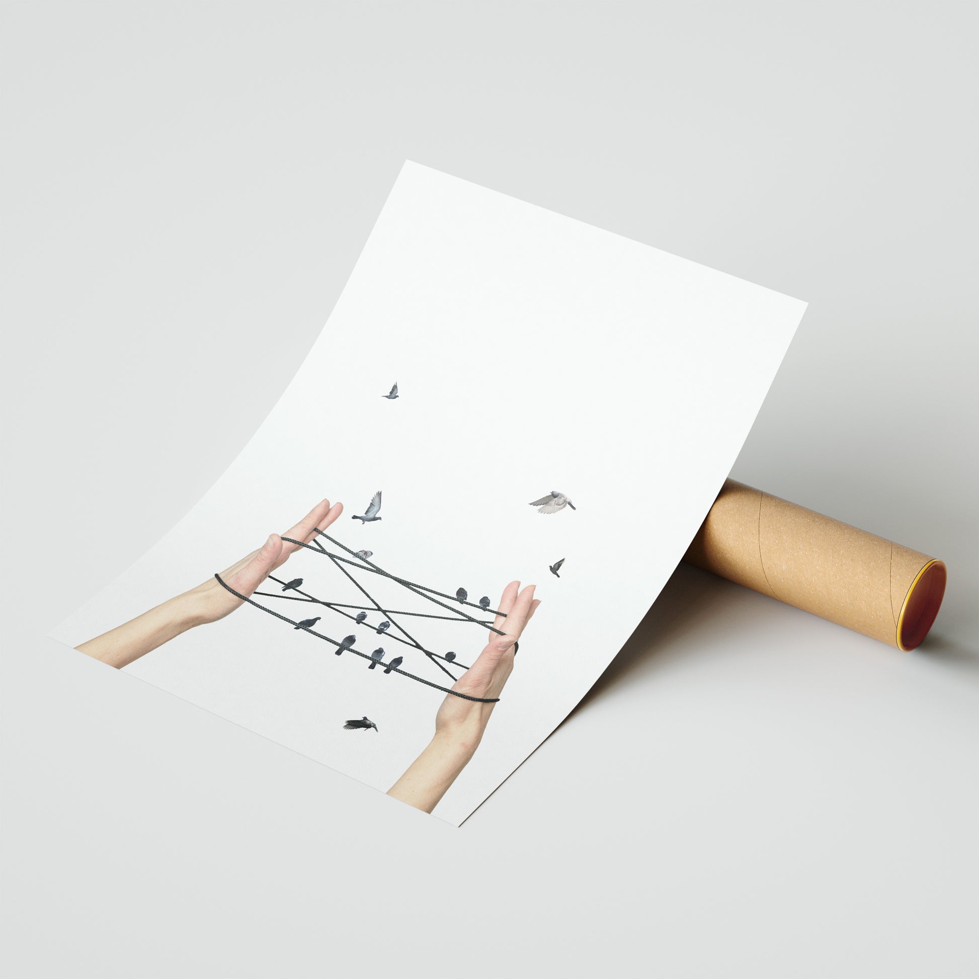Break free from the ordinary with this poetic and minimalistic surreal artwork. Featuring a pair of hands holding tangled strings that double as telephone wires for perched and flying birds, this piece beautifully explores the tension between control and freedom. It's a visual metaphor for life’s delicate balance—structured yet spontaneous.