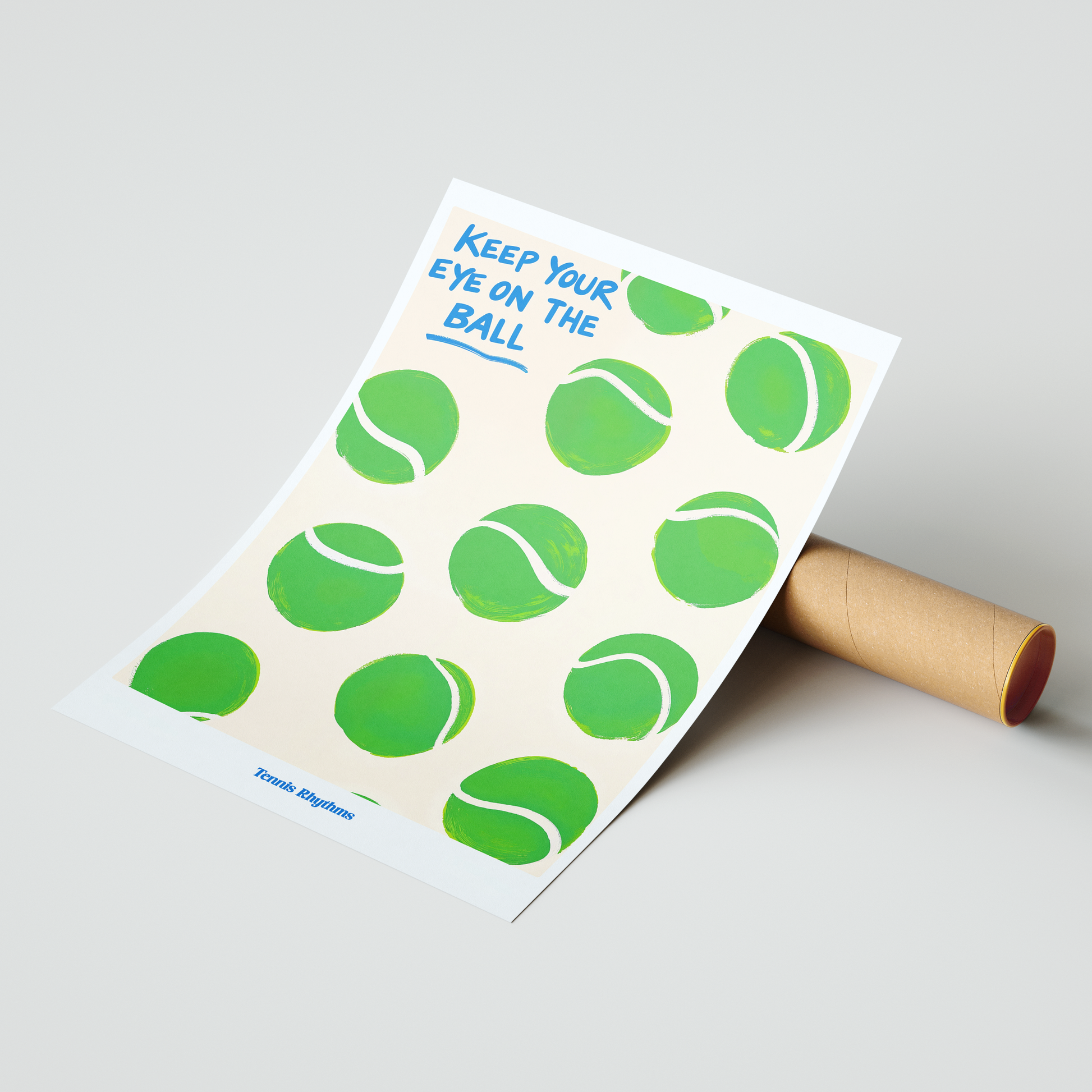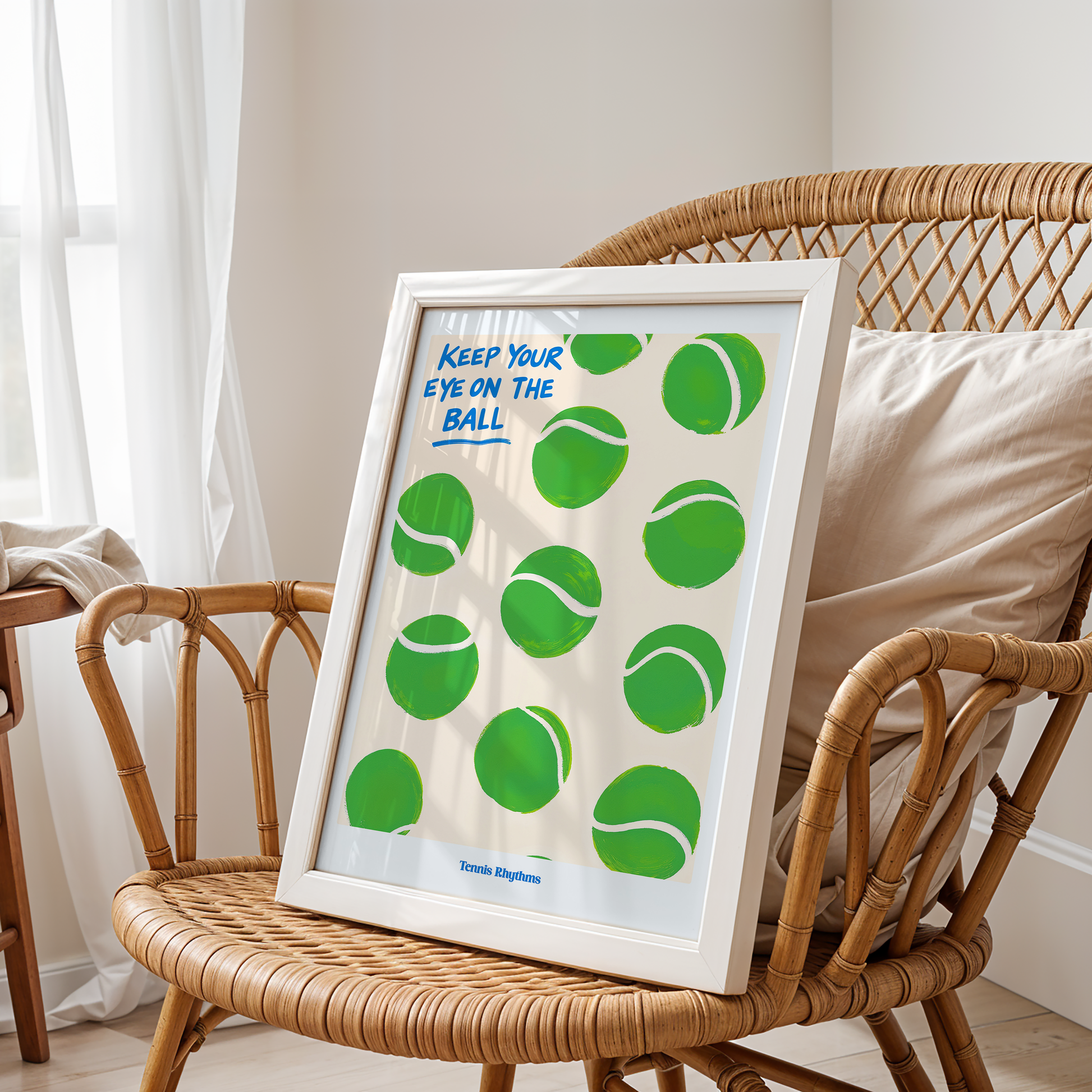 Energize your space with movement and motivation through "Tennis Rhythms: Keep Your Eye on the Ball," a lively sports-inspired poster from the Dopamine Gallery collection. This playful print features vibrant green tennis balls bouncing across a creamy backdrop, accompanied by the uplifting hand-lettered reminder to stay focused—on the game and in life! The rhythmic layout and fresh palette make it perfect for gyms, study corners, sports rooms, or any area that thrives on goal-setting and good energy. "Tennis Rhythms" is more than decor—it’s a daily nudge to keep your priorities in sight and approach every day with enthusiasm and precision.