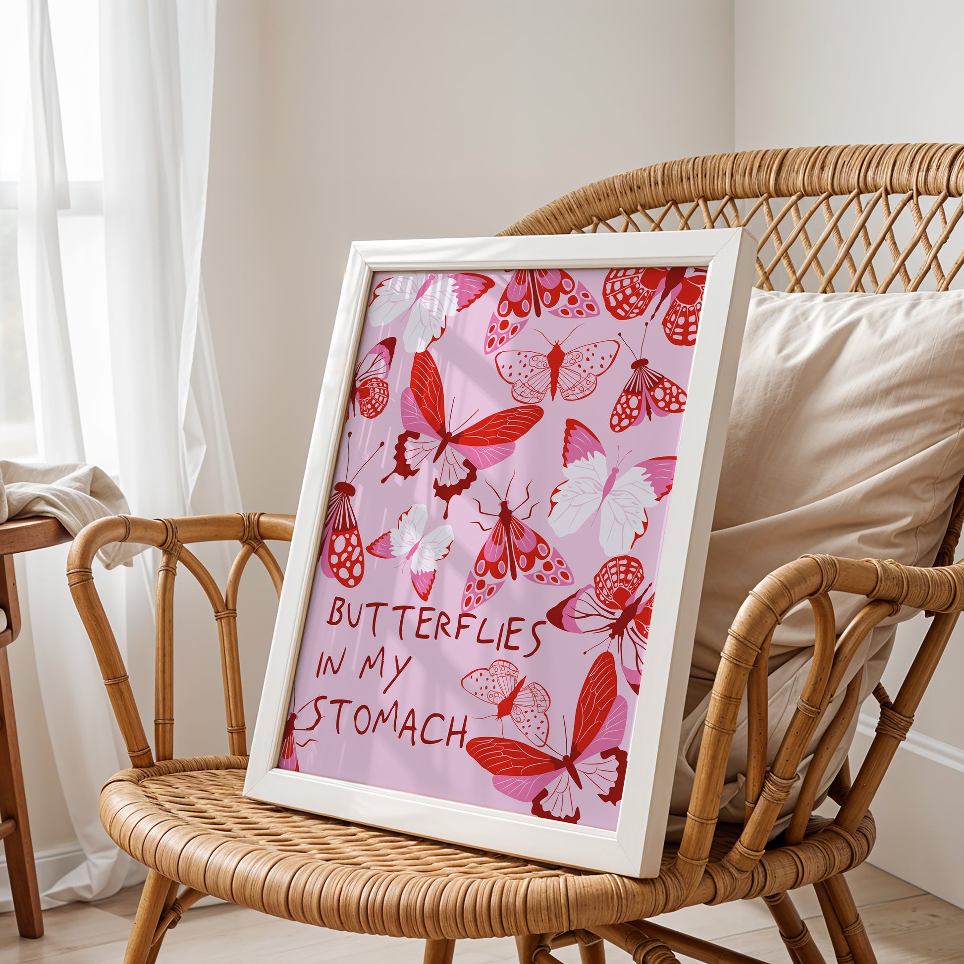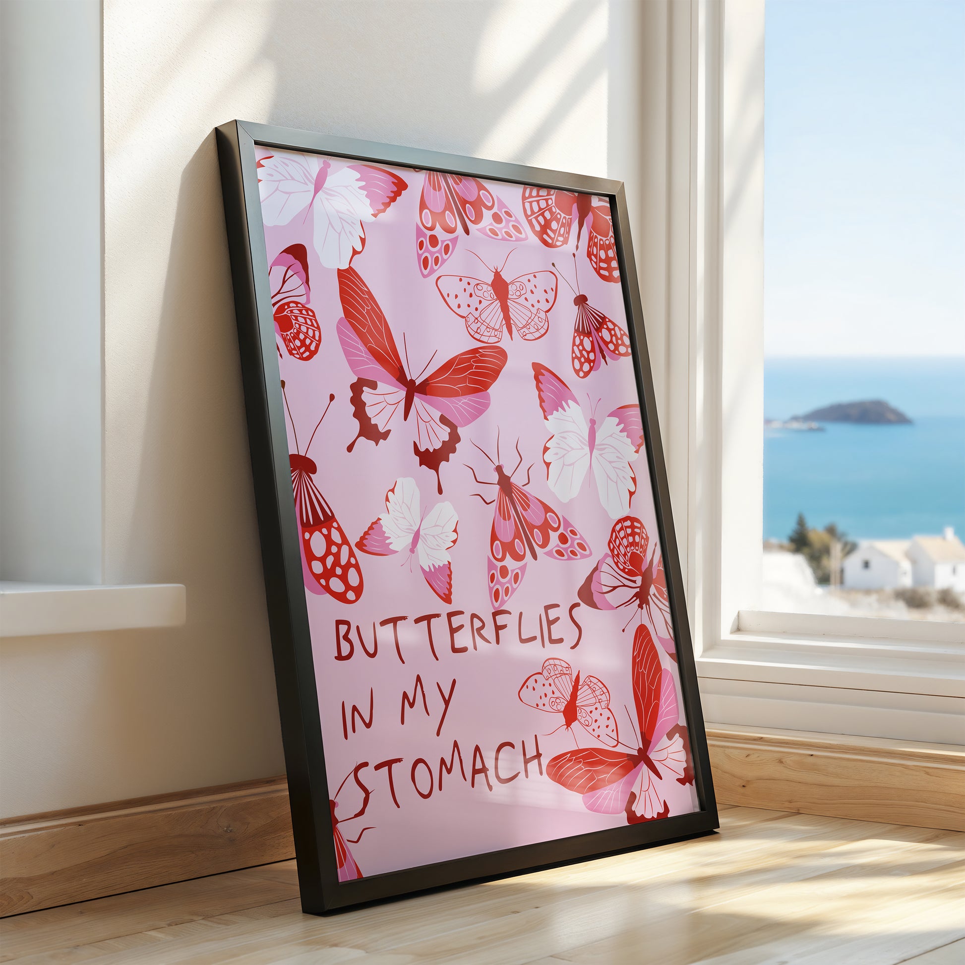 The hand-lettered "Butterflies In My Stomach" text adds a personal, diary-entry feel. Perfect for a bedroom, dorm room, or as part of a dreamy gallery wall, this print adds a touch of playful romance and feminine energy to your space. It's the perfect gift for your crush, your partner, or yourself.