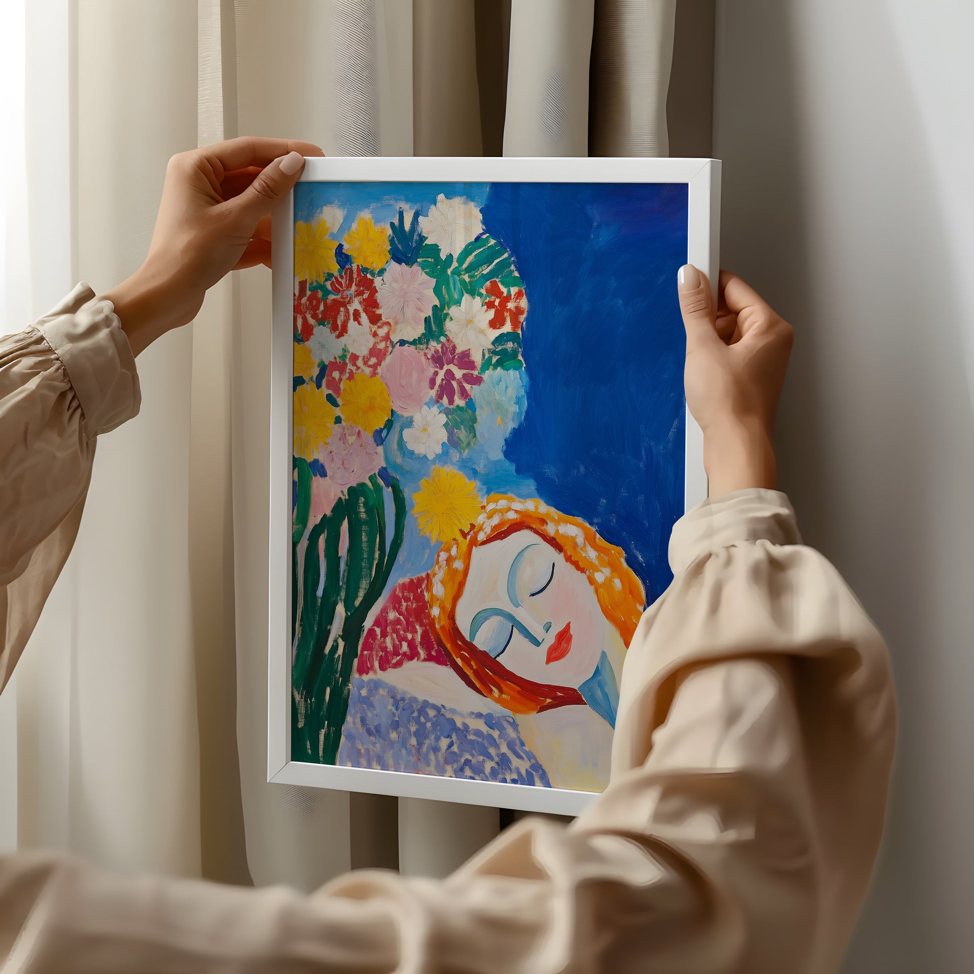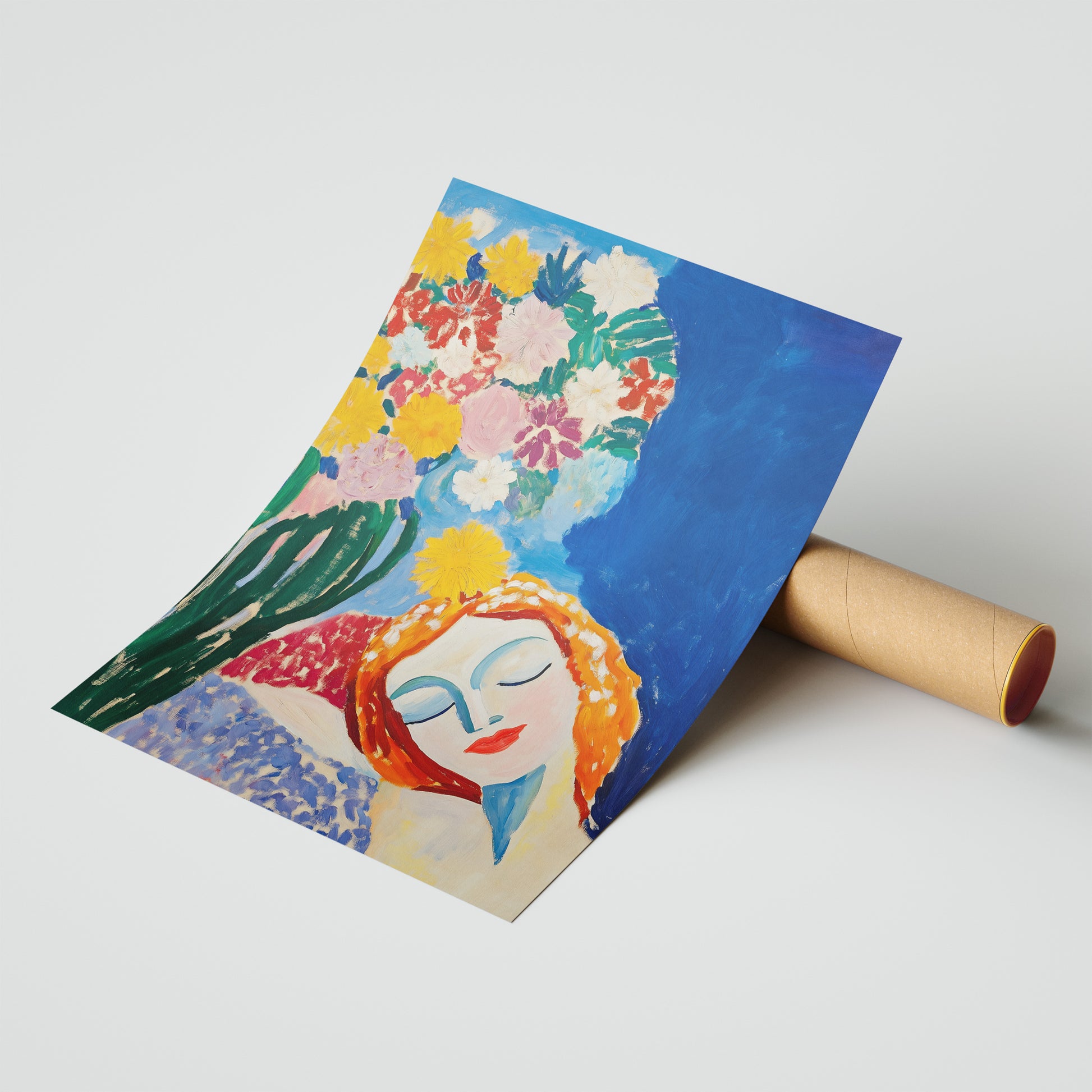 "The Dreamer" captures a moment of tranquil slumber in a burst of Post-Impressionist color. A figure with vibrant red hair rests peacefully, dreaming beneath a magnificent, overflowing bouquet of expressive flowers. The deep blue background makes the warm yellows, reds, and pinks pop, creating an intimate and artful scene of peaceful reverie and beauty.