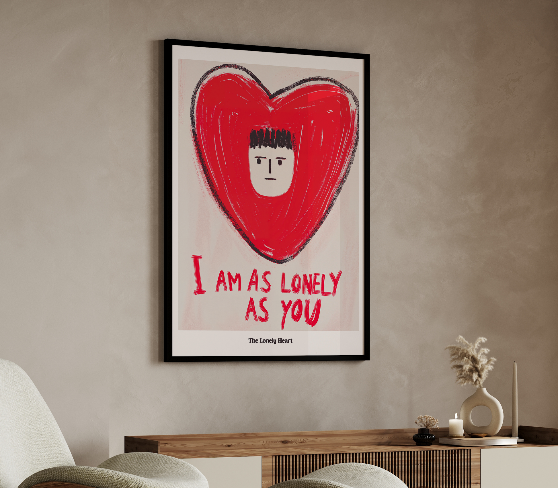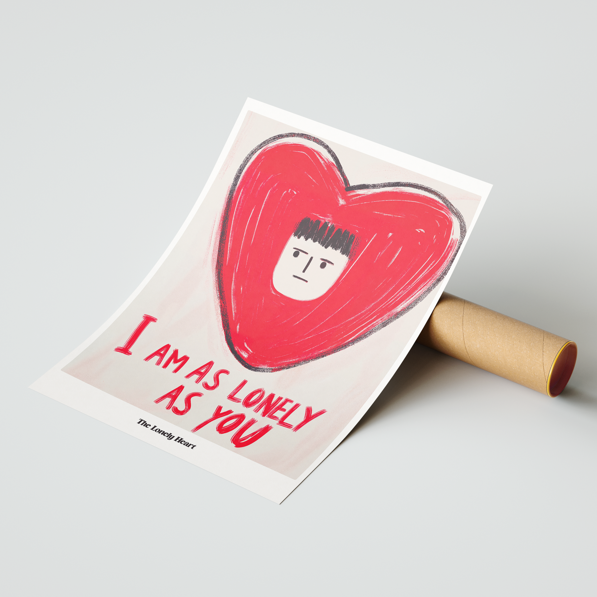Channel vulnerability and connection with "The Lonely Heart: I Am As Lonely As You," a raw and honest art print from the Dopamine Gallery collection. This minimalist illustration features a solitary face inside a bold, hand-drawn red heart, paired with the touching message: “I am as lonely as you.” The artwork resonates with universal feelings of solitude, empathy, and longing—making it deeply relatable and powerful. Perfect for bedrooms, reading corners, or spaces where introspection and honesty are welcome, "The Lonely Heart" offers comfort and solidarity, reminding us that even in loneliness, we’re never truly alone. Uplifting yet poignant, it’s a standout piece for art lovers who appreciate emotional truth.