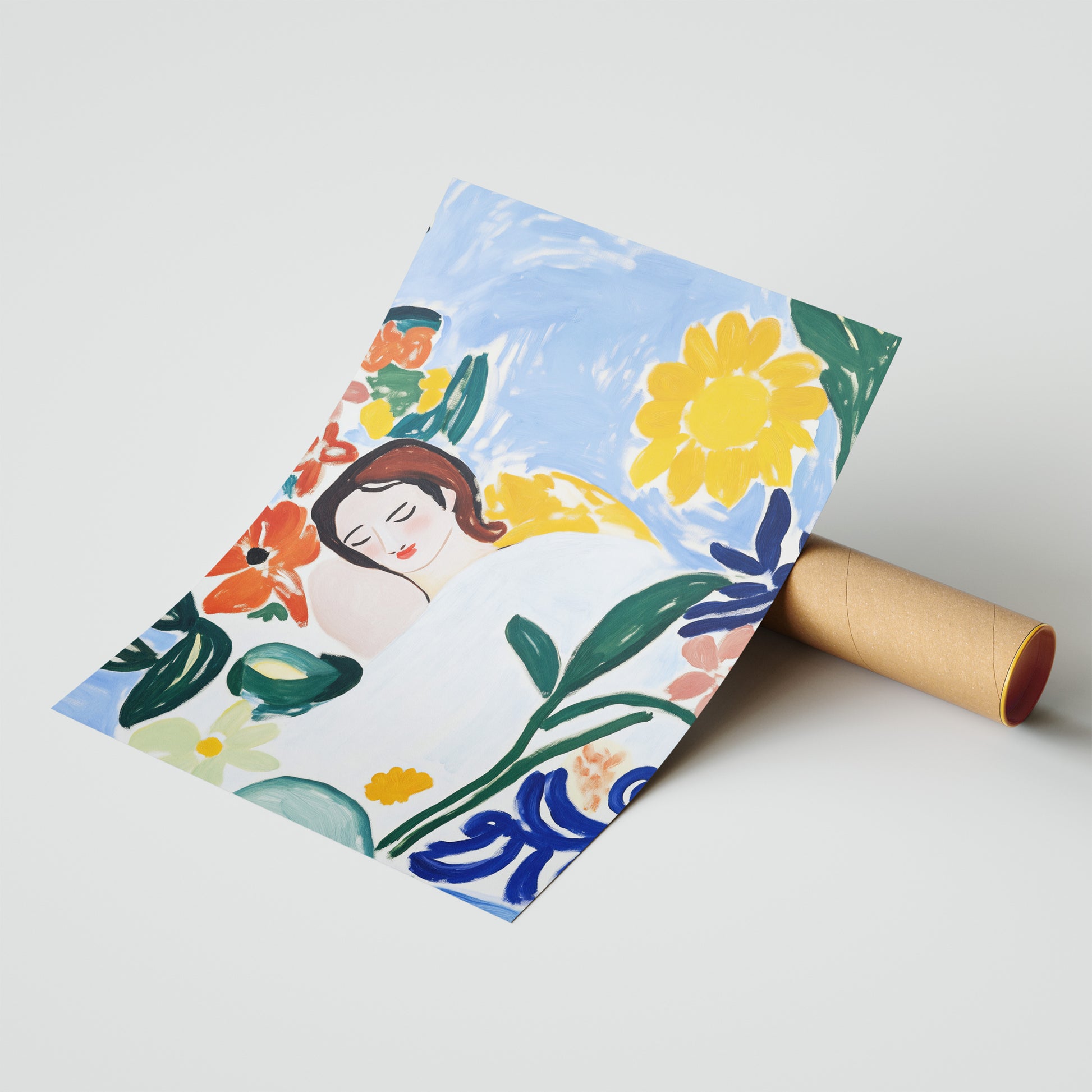 "The Sunflower Dream" captures a moment of deep, peaceful slumber in a vibrant garden setting. This Post-Impressionist poster shows a figure resting, their dark hair fanned out on a yellow pillow, surrounded by oversized, expressive flowers. A large sunflower, a bold red bloom, and various other colorful plants create a lush, protective bower, evoking a sense of complete tranquility and connection to nature.